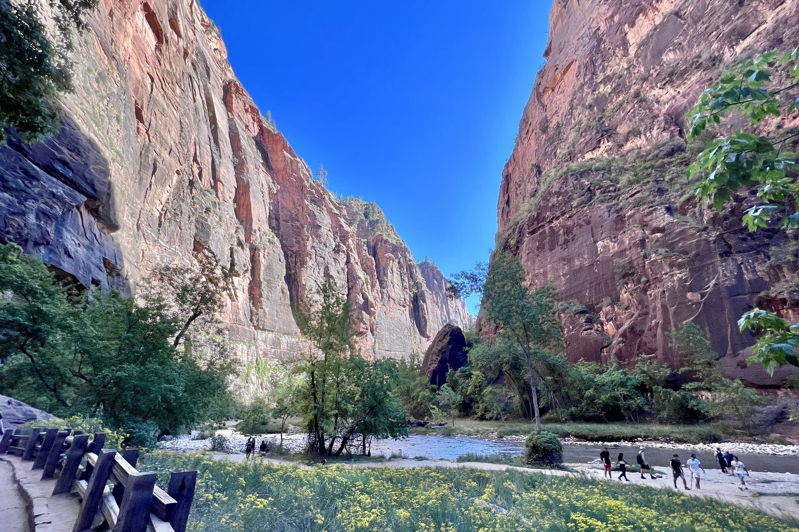 To hike this trail, you’ll take the shuttle for 40 minutes, all the way to Stop 9, at the end of Zion. You’ll then walk along the easy 1.6km Riverside Walk Trail that’s flat and paved. At the end of this trail is the beginning of the Narrows, which goes along and through the Virgin River.