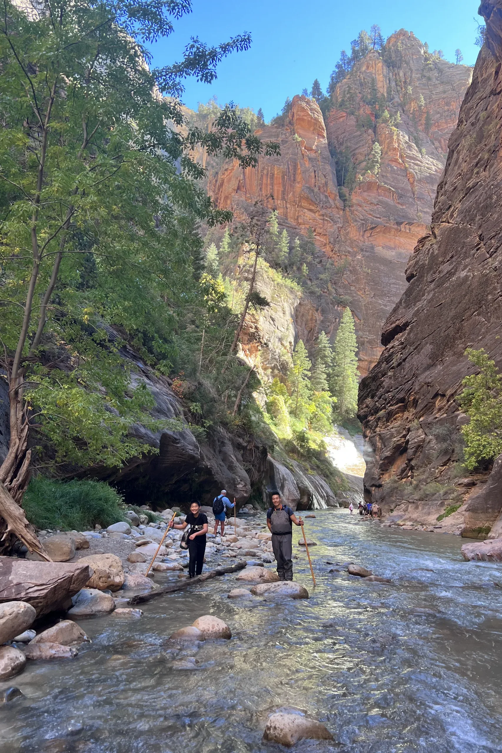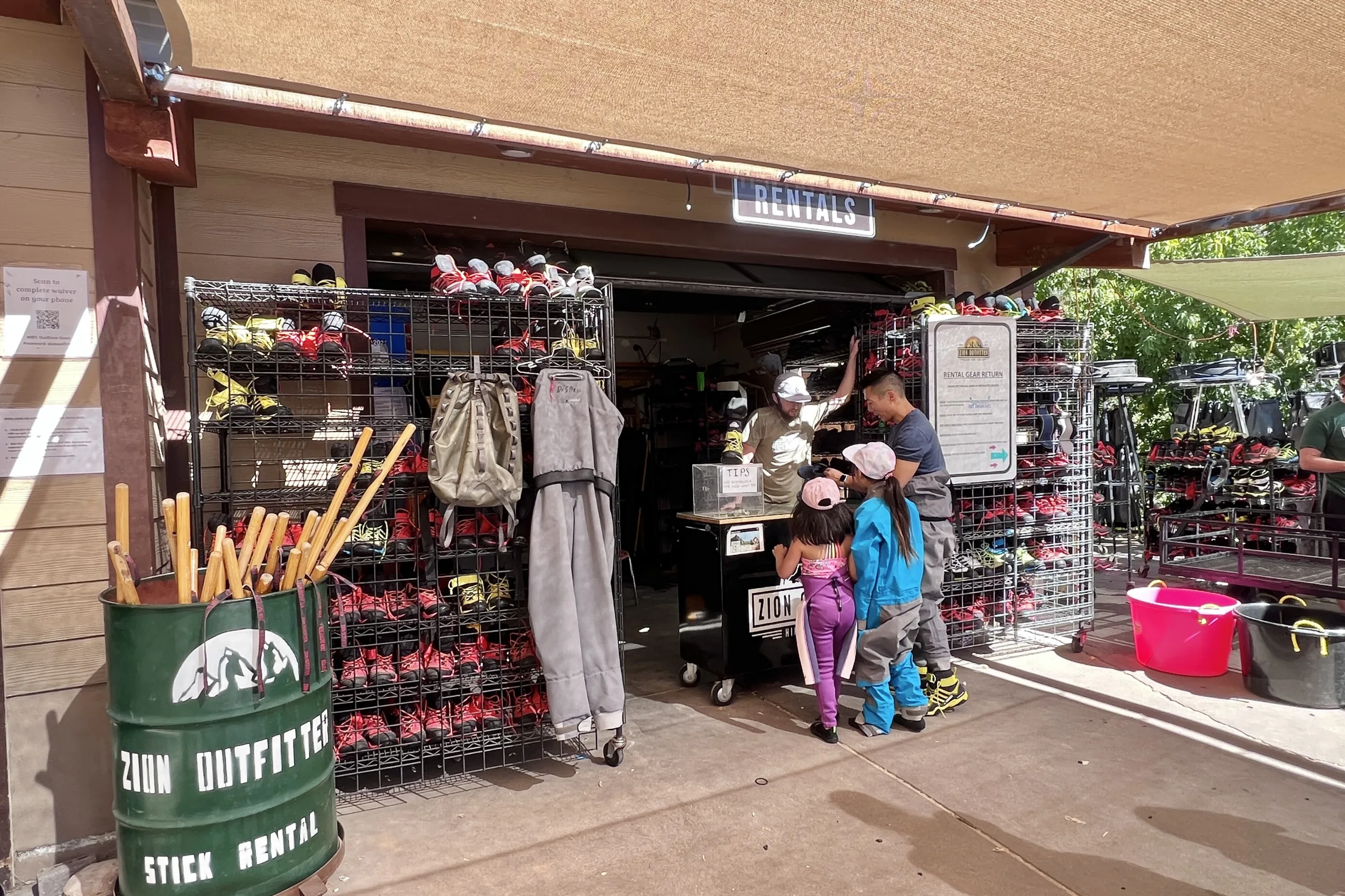 You can rent walking sticks, boots, neoprene socks, and waterproof bibs and suits from Zion Outfitters, located just outside the south entrance to Zion National Park. Keep in mind that their smallest suits fit about an eight- or nine-year-old, and the smallest boot size they have is size 11.