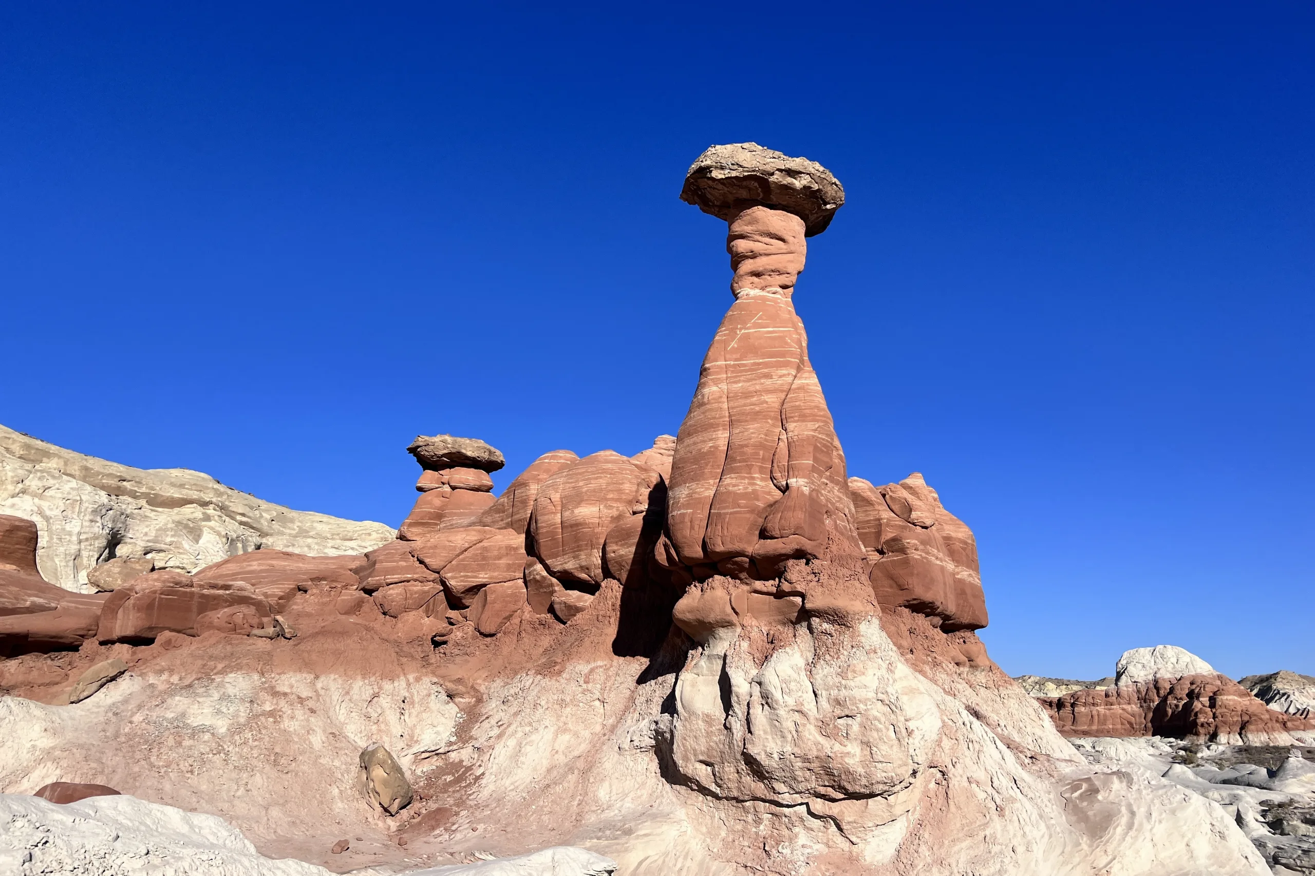 Toadstool Hoodoos Trail is a short 3km round-trip trail that takes you to see rock formations created when an erosion-resistant rock is left on top of a more easily eroded rock underneath, creating the appearance of a toadstool.
