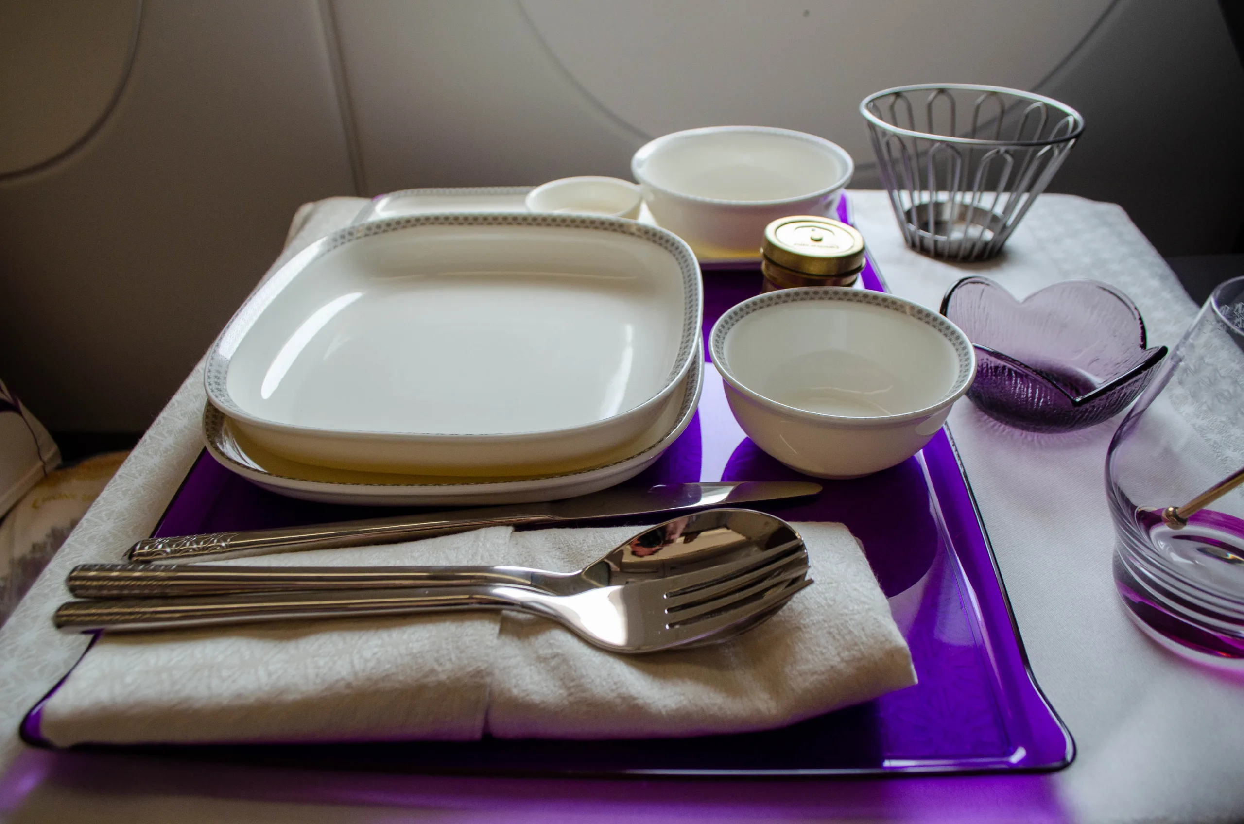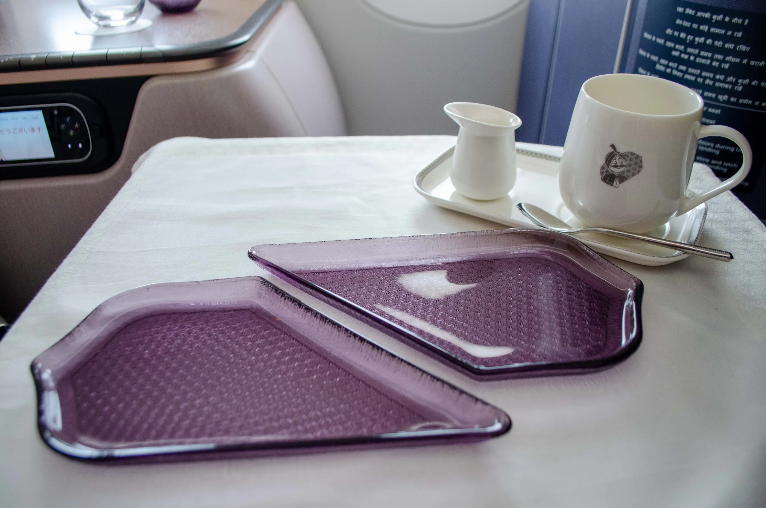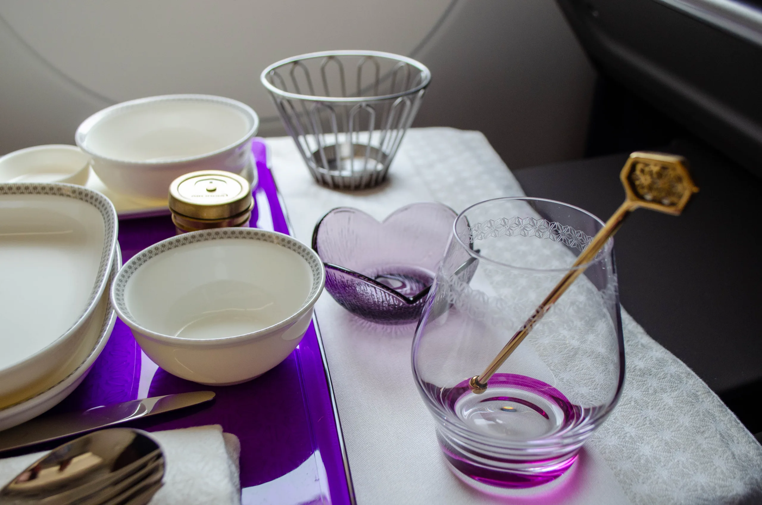 Passengers travelling in premium economy will have meals served on lightweight tableware, with Mandala patterns etched on side plates, bowls, and glasses.