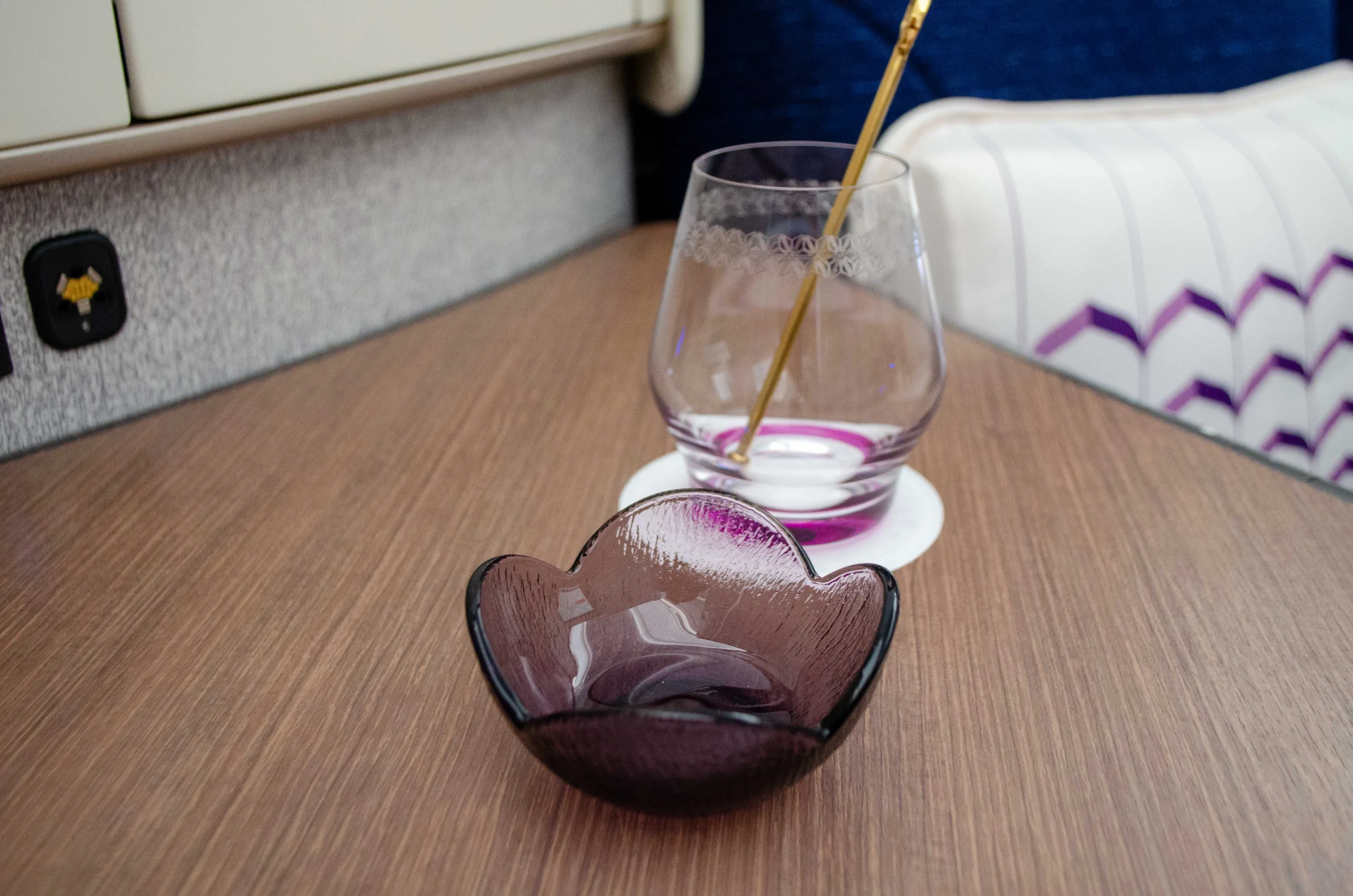 Etched into the glassware are Mandala patterns, which are beautifully presented on the airline’s new Slovakian glassware.