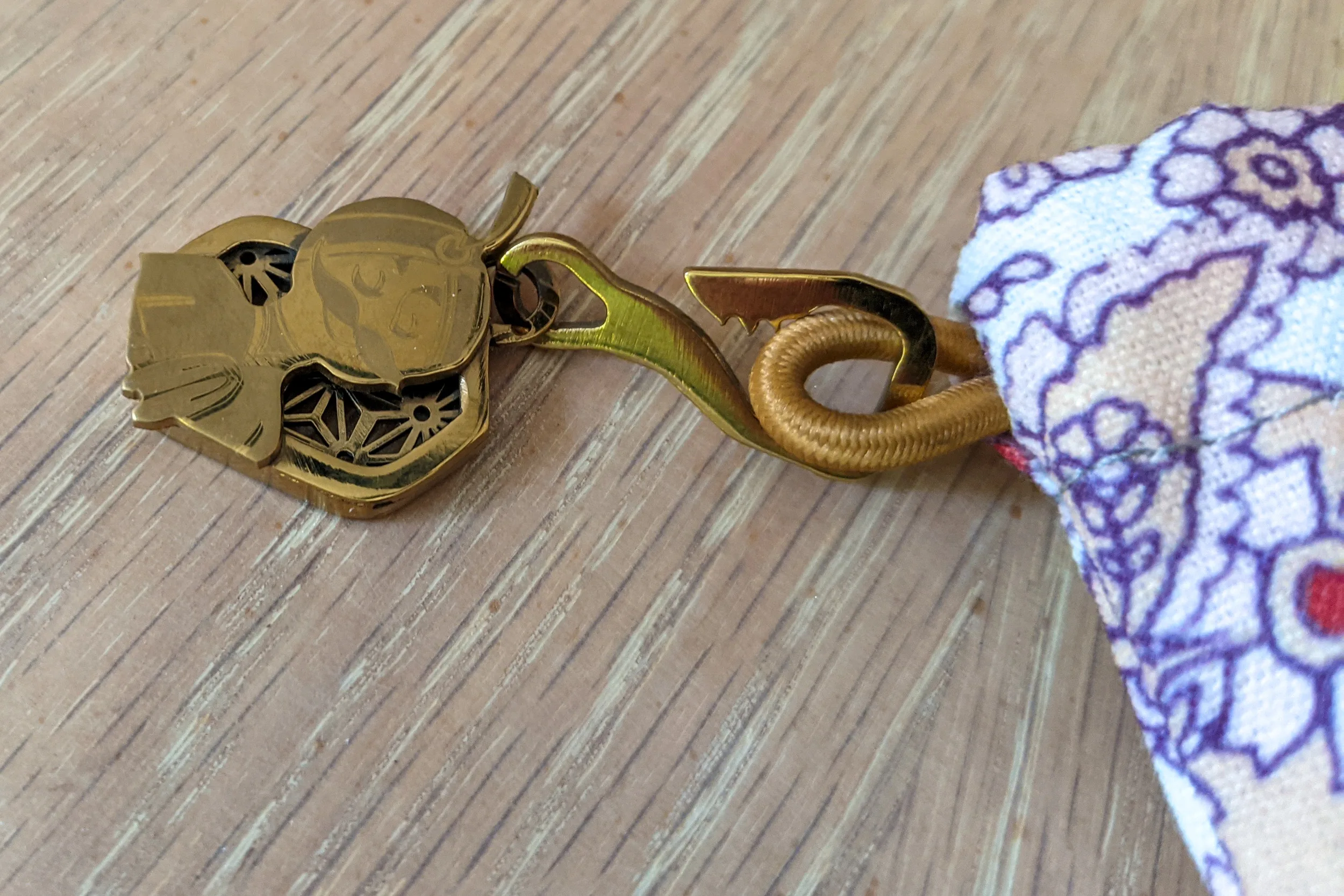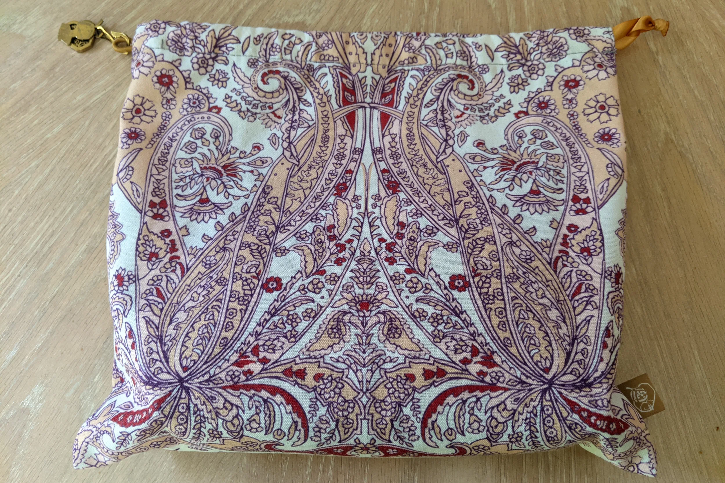 The actual amenity kit is encased in a presentation bag featuring various printing styles of India. A Maharaja charm hangs from one side of the pouch, with a drawstring on the other.