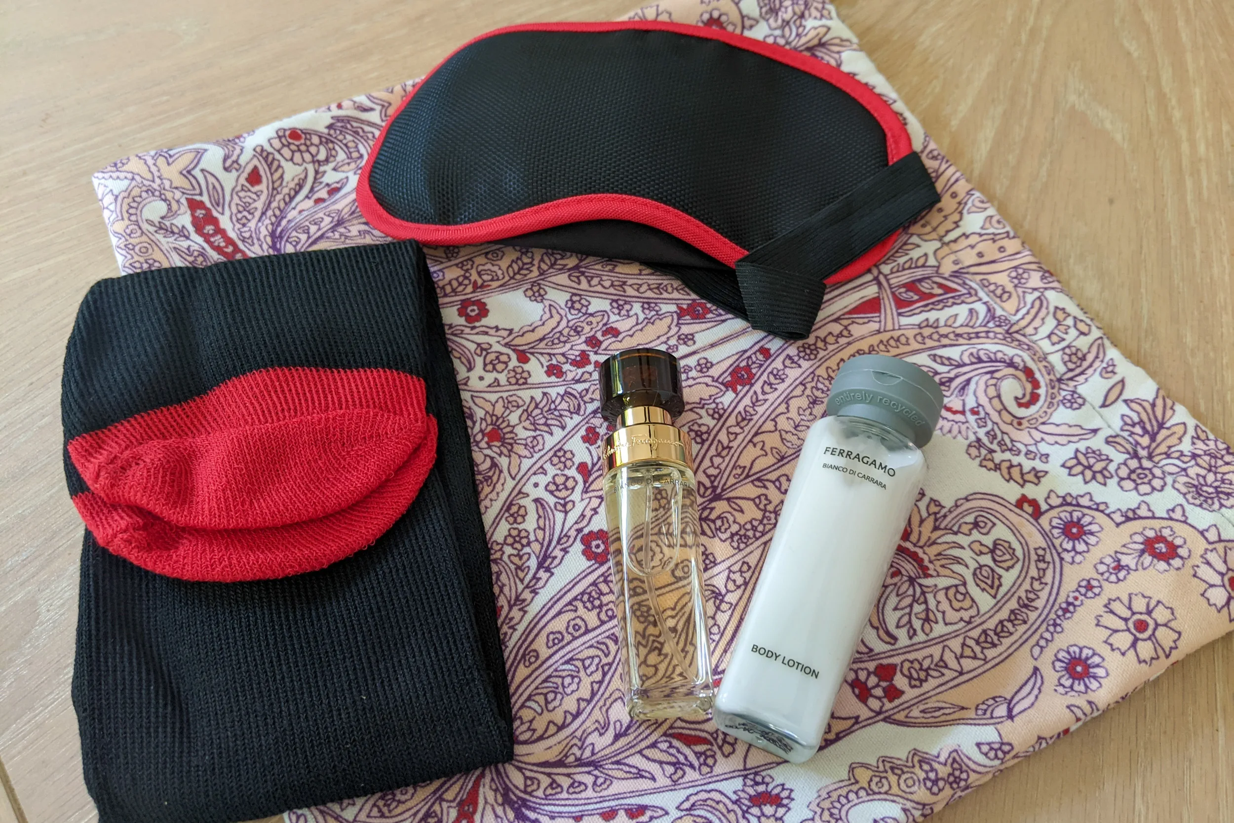 Inside, there’s a Ferragamo amenity kit, which includes Ferragamo body lotion, hand cream, lip balm, socks, and an eye mask.