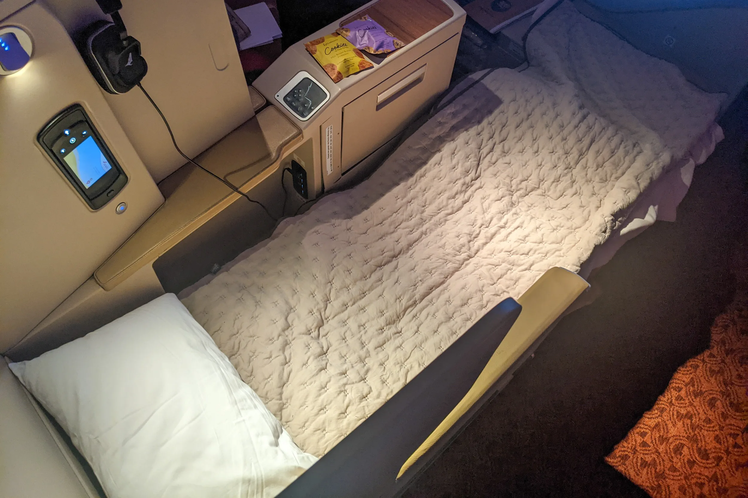 In business class, the memory-foam mattress topper is housed in a large pillow, and can be unfurled when it comes time to lay down.