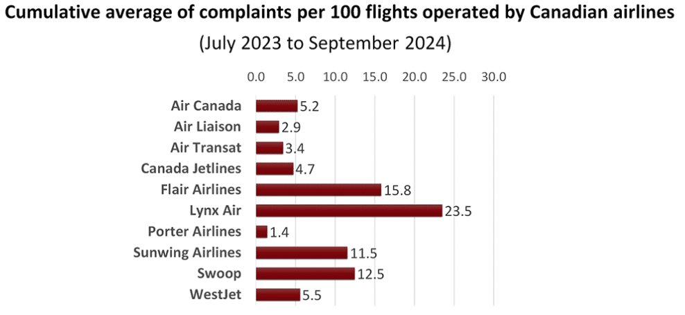 Air Canada saw 5.6 complaints (up from 4.7) and WestJet received 7.7 complaints per 100 flights, up from 5 complaints for the previous period of April to June 2024.
