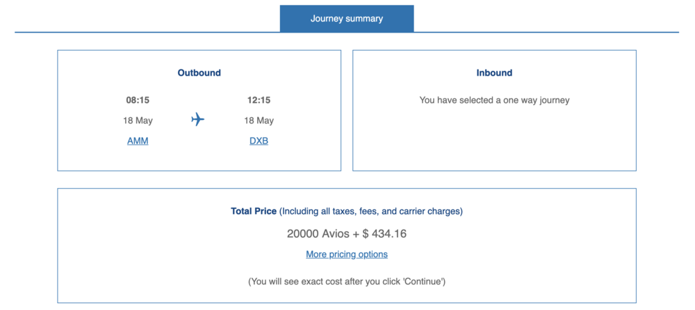 In the end, I decided not to play stupid games with Avios; instead, I discovered that Oman Air allows you to add a complimentary stopover in Muscat on your way from Amman to Dubai as part of their regular cash fares, so I went ahead and booked an Amman–Muscat–Dubai ticket for $323 per person in economy class.