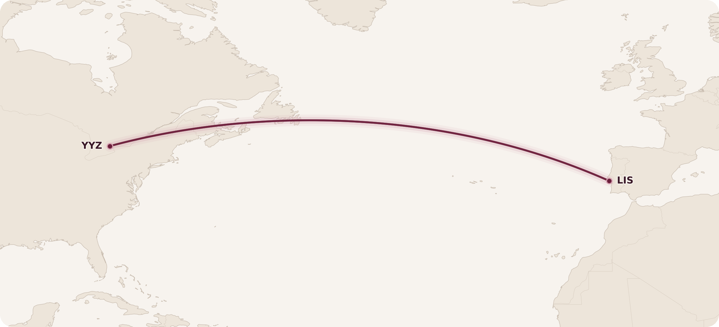Toronto Pearson to Lisbon on TAP Air Portugal, departing 10:55pm and arriving 10:50am the next day