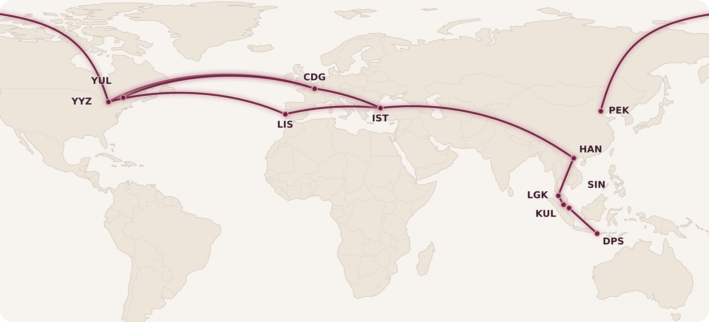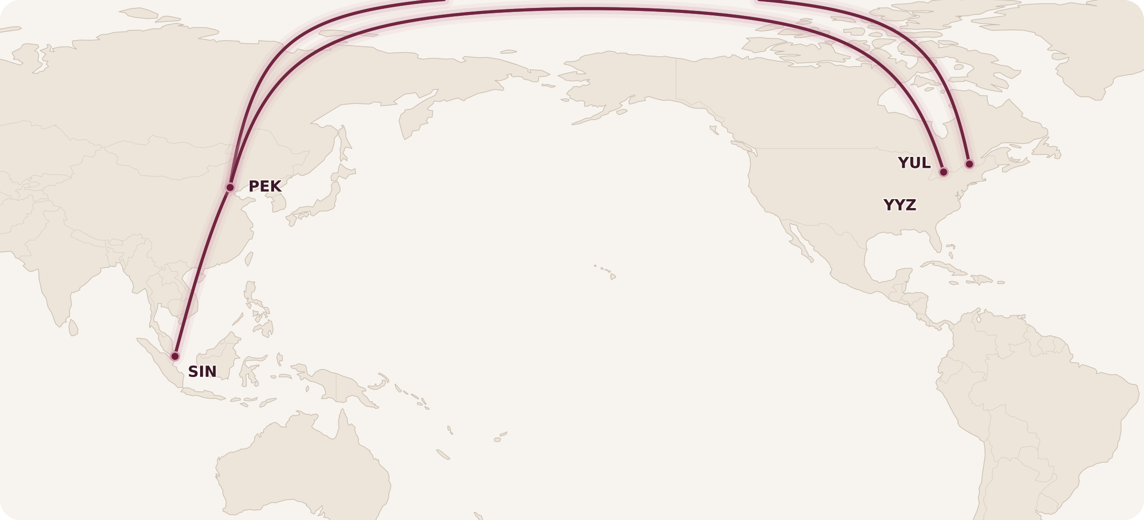 Now, to get ourselves back to Toronto in mid-January, the only transpacific premium cabin I found was with Air China business class from Beijing, which I’ve never flown before. I snagged the open availability on the Beijing–Montreal Dreamliner route, after which a quick turboprop flight would bring us back to Toronto’s Billy Bishop Airport.