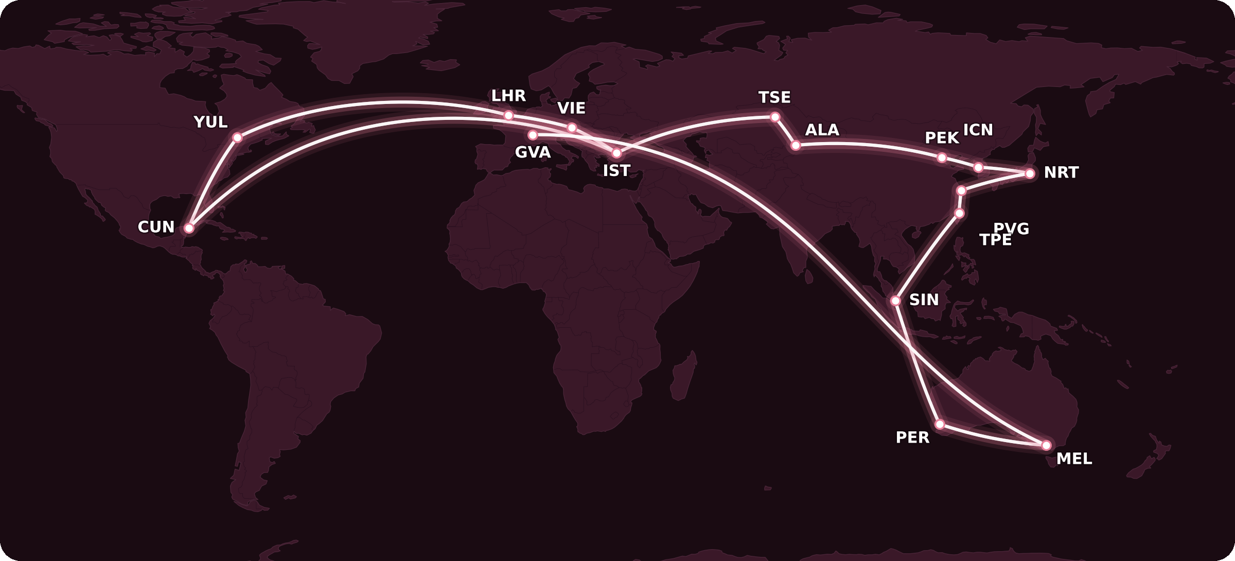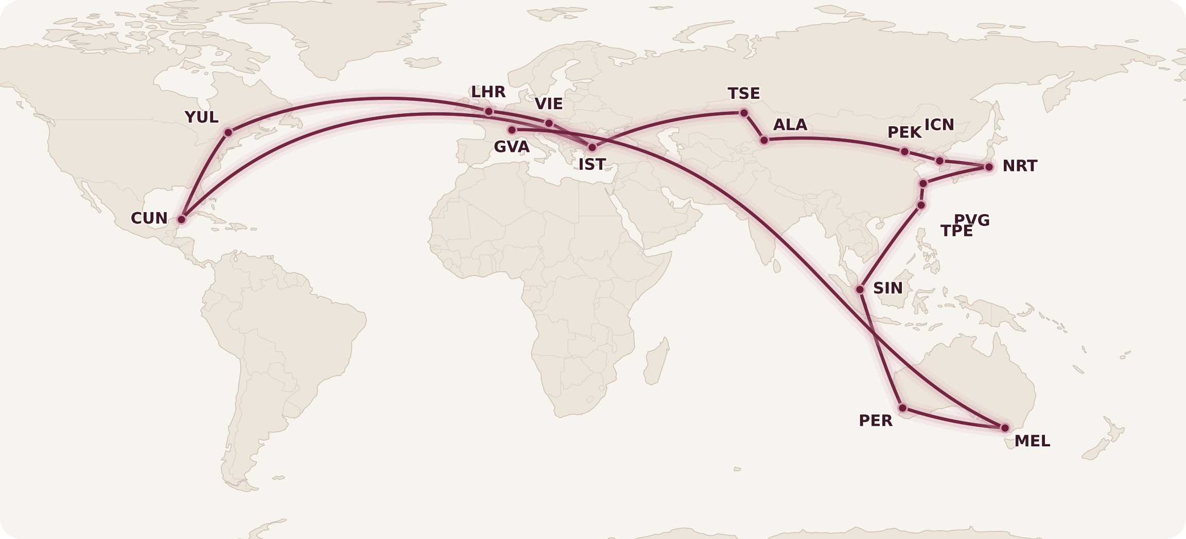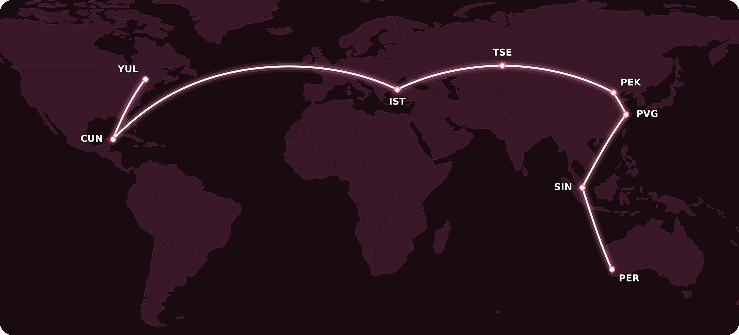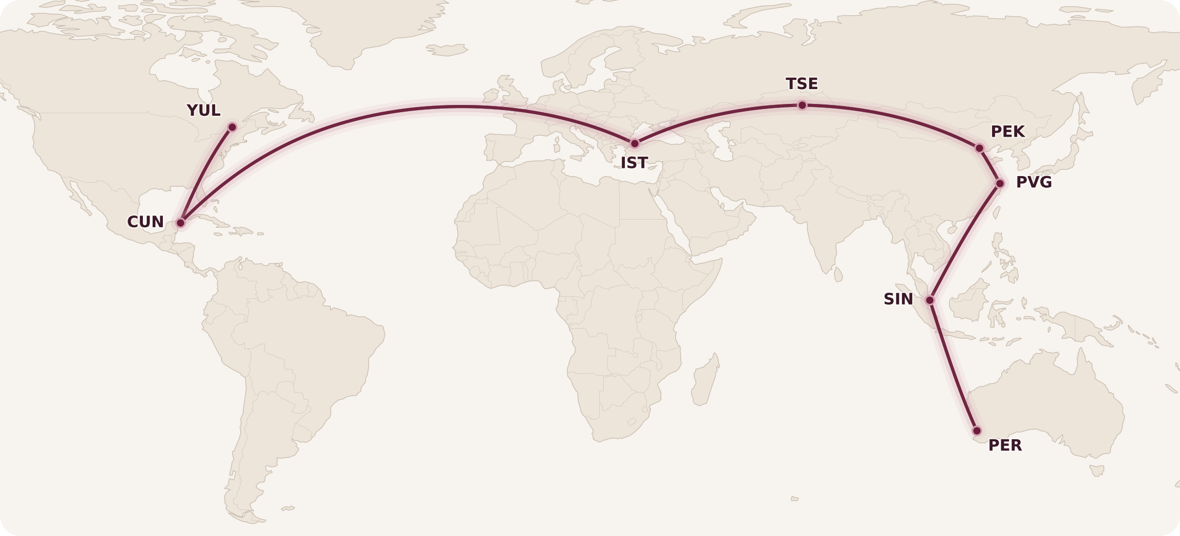The maximum permitted mileage (MPM) between these two cities is a whopping 18,204 miles, which is what gives me license to fly south to Cancún first, before flying east to Nur-Sultan via Istanbul, continuing further east to Shanghai, and then turning south in the direction of Perth.