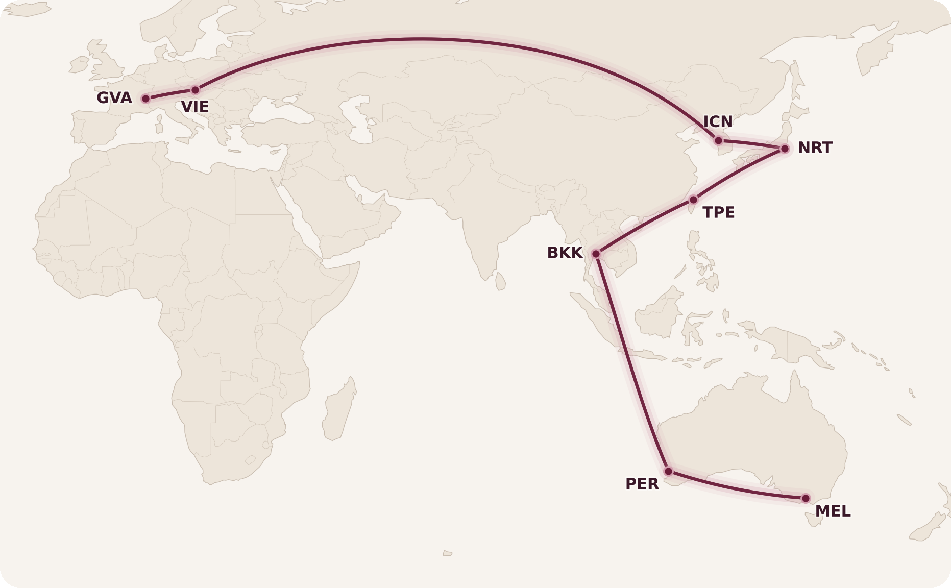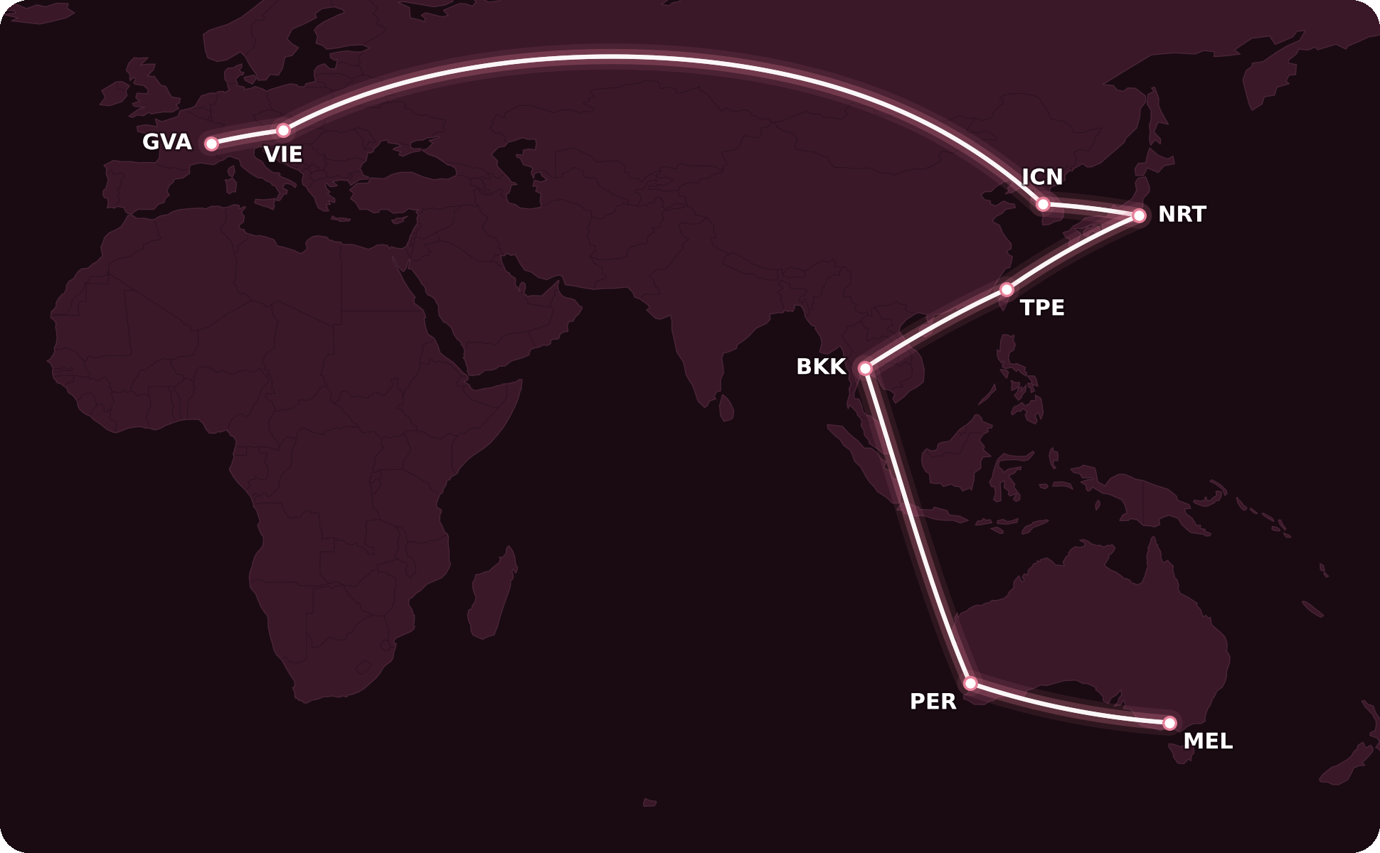 Depending on how you look at it, either the most gruelling or the most enjoyable part of the journey is between Melbourne and Geneva, where I’ll be flying more than 15,500 miles in distance over the span of 53 hours.