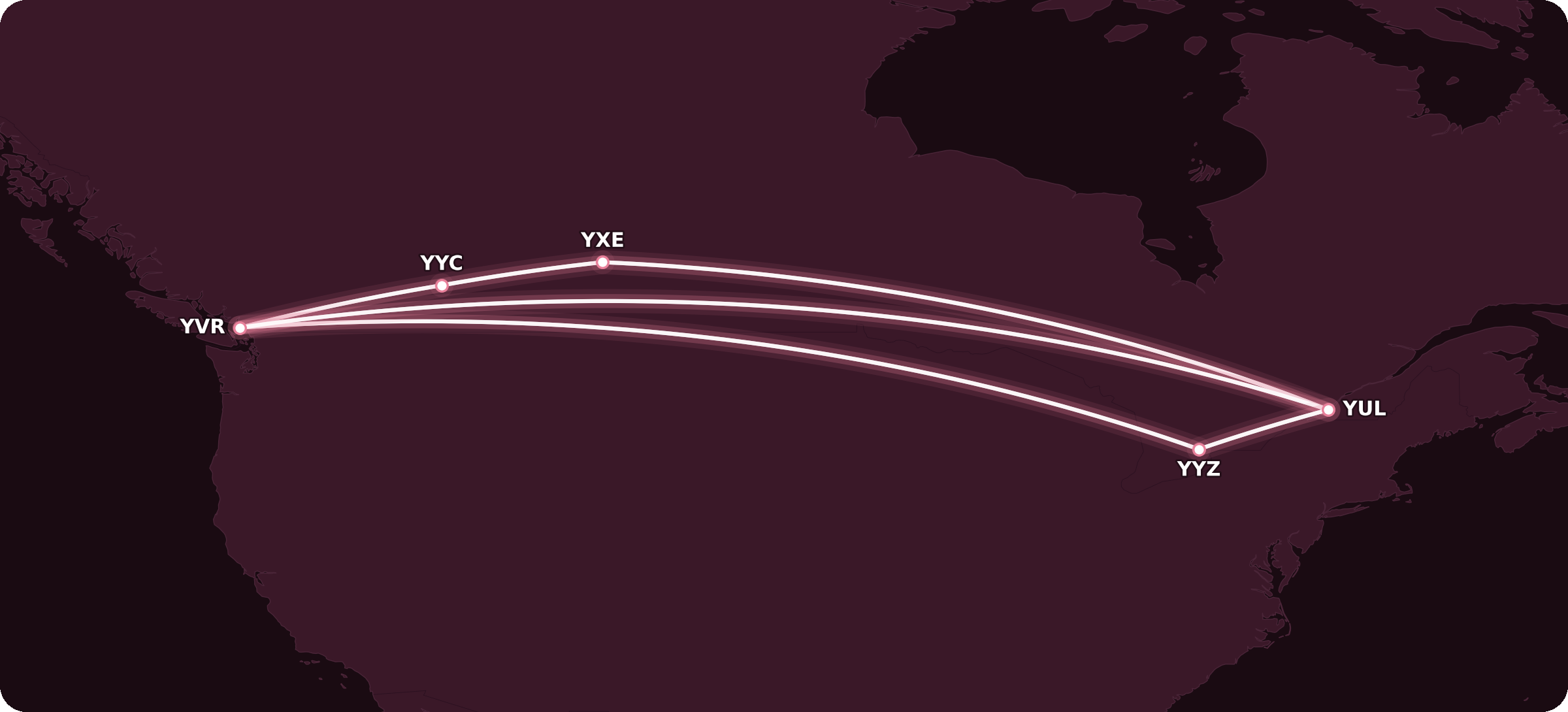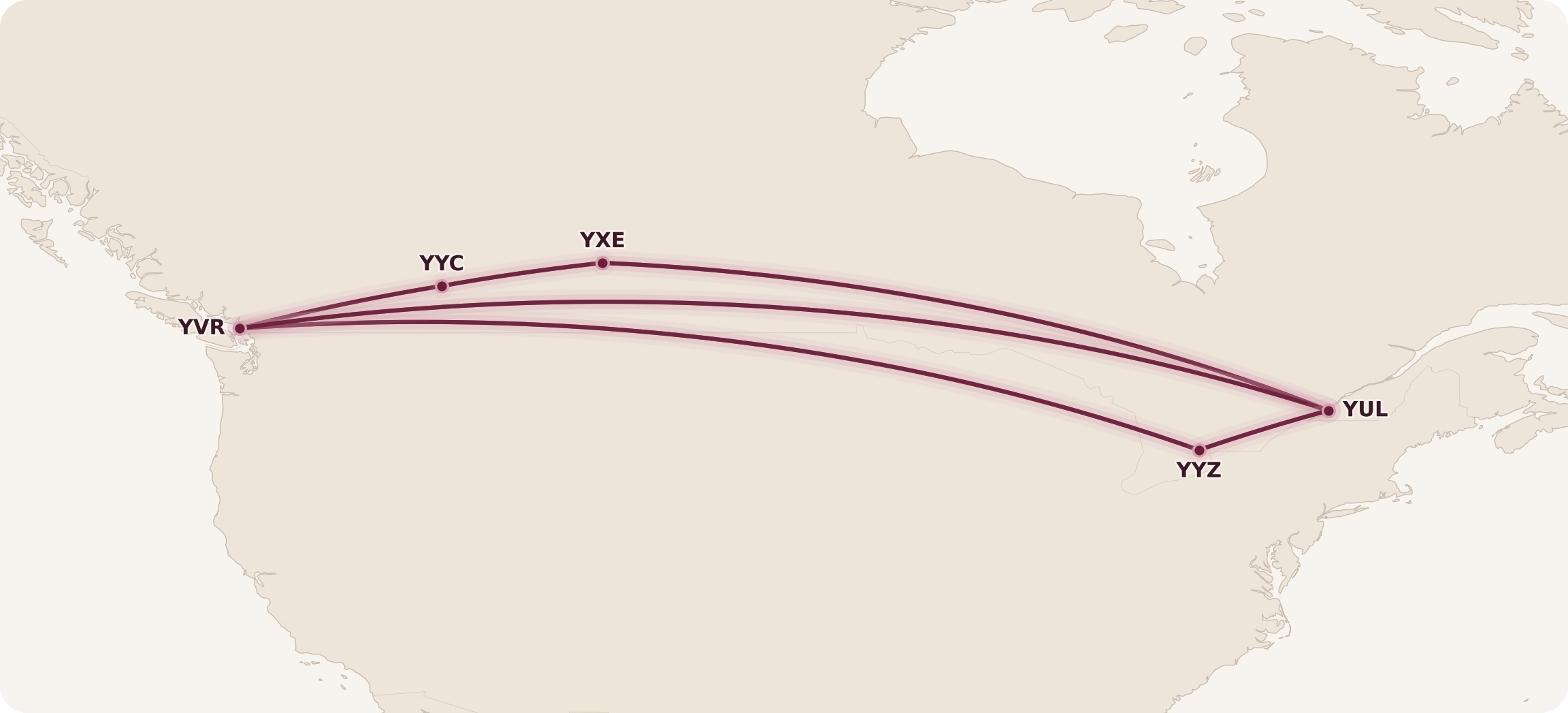 - Vancouver to Saskatoon, business class, departing 8:30pm and arriving 11:24pm