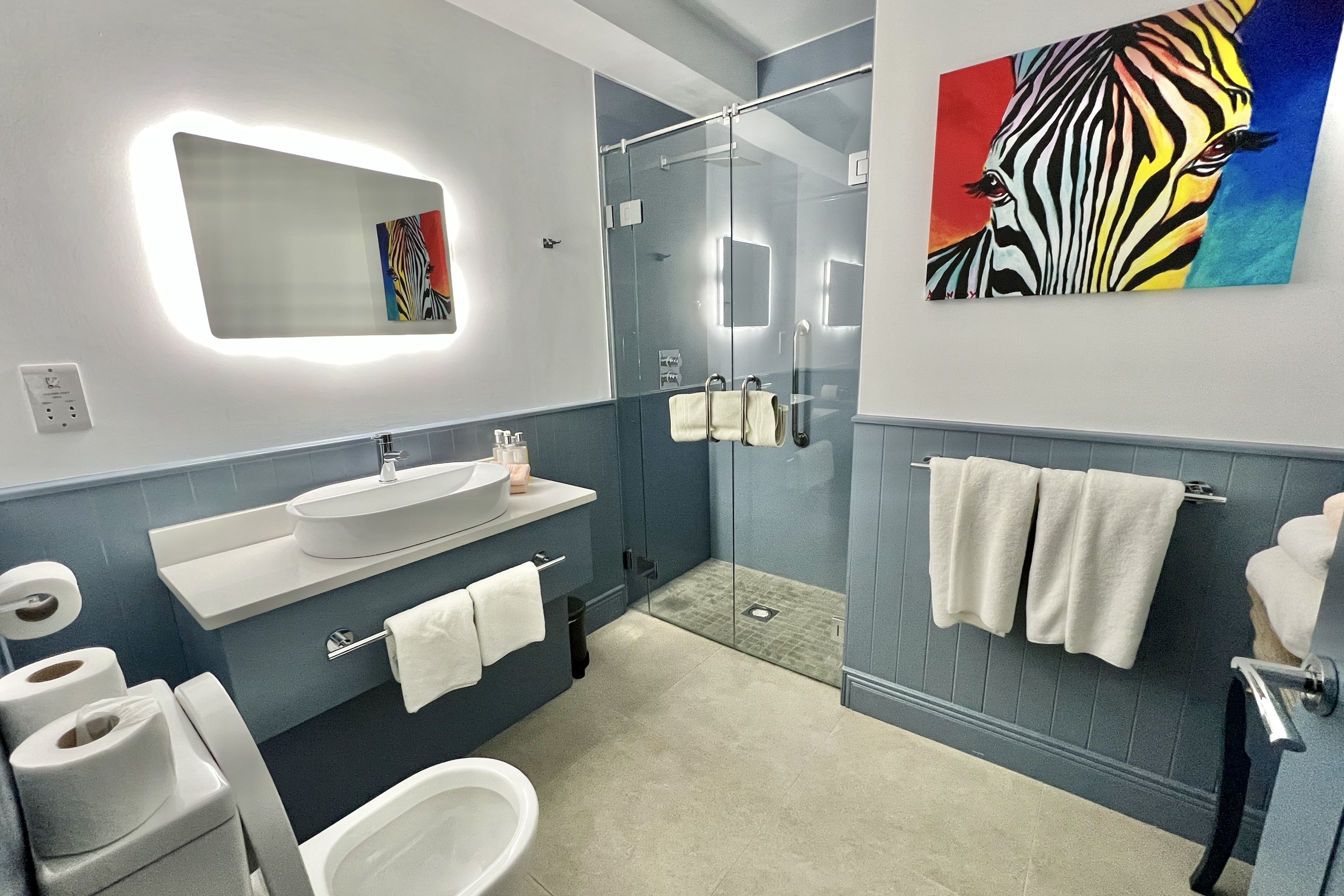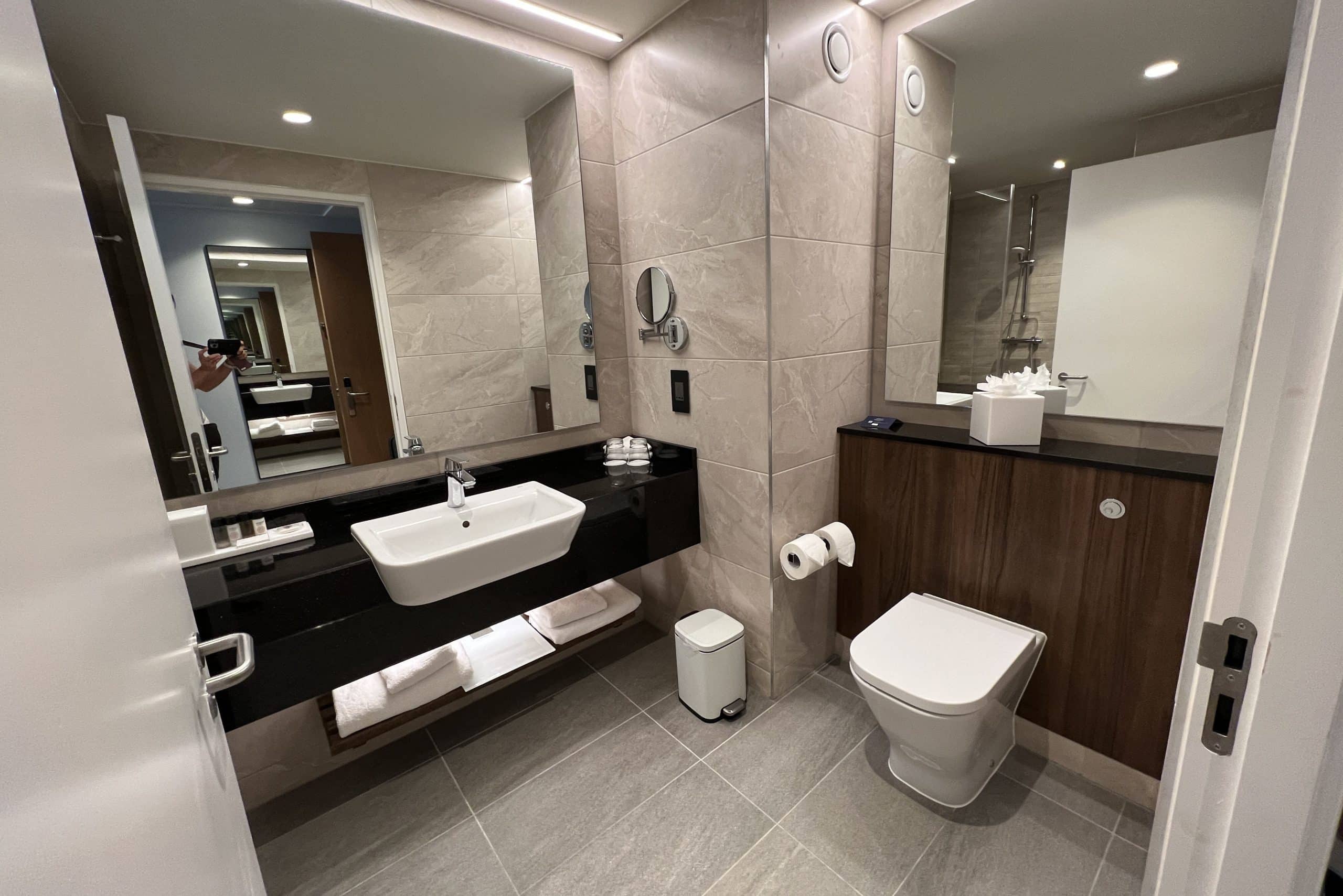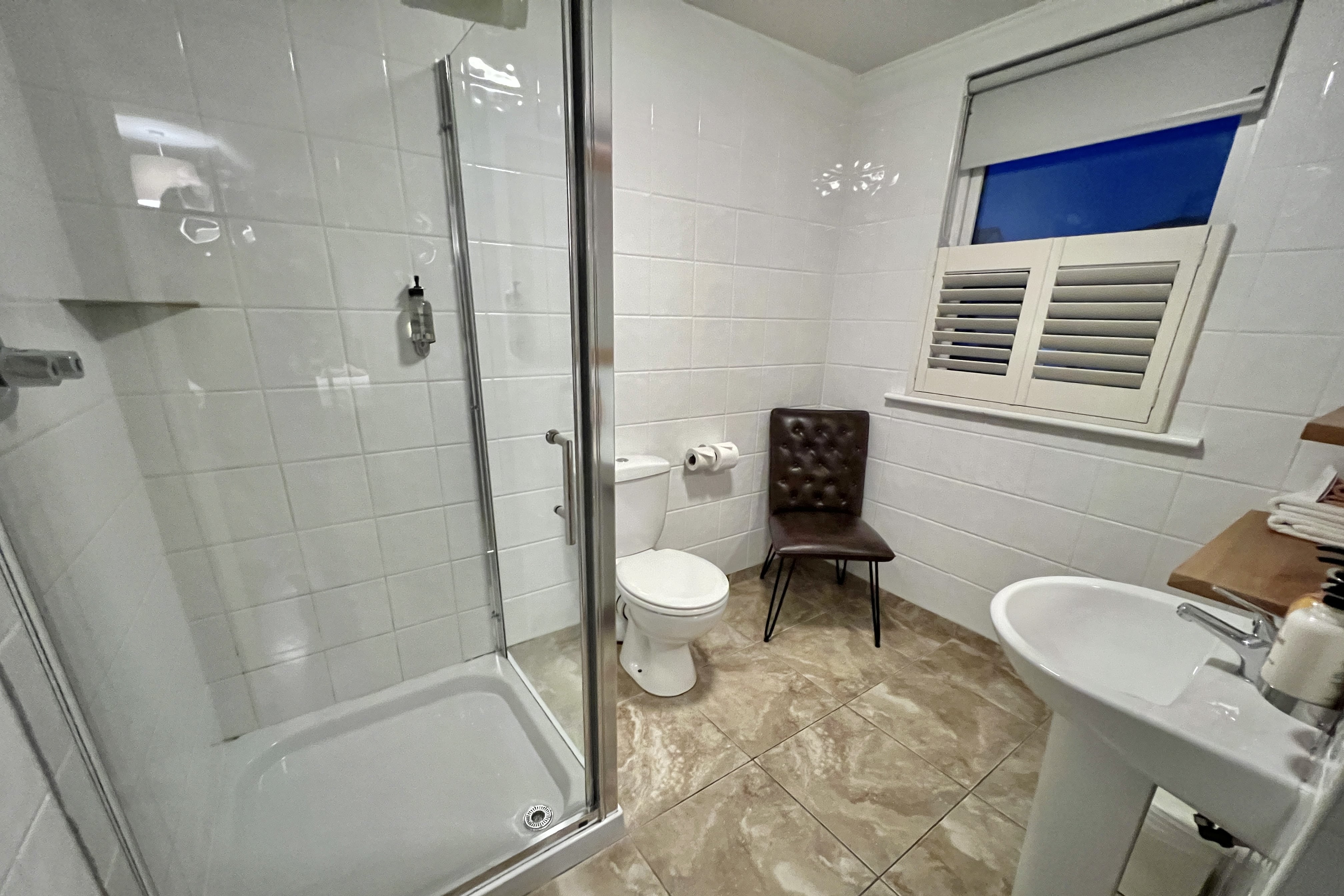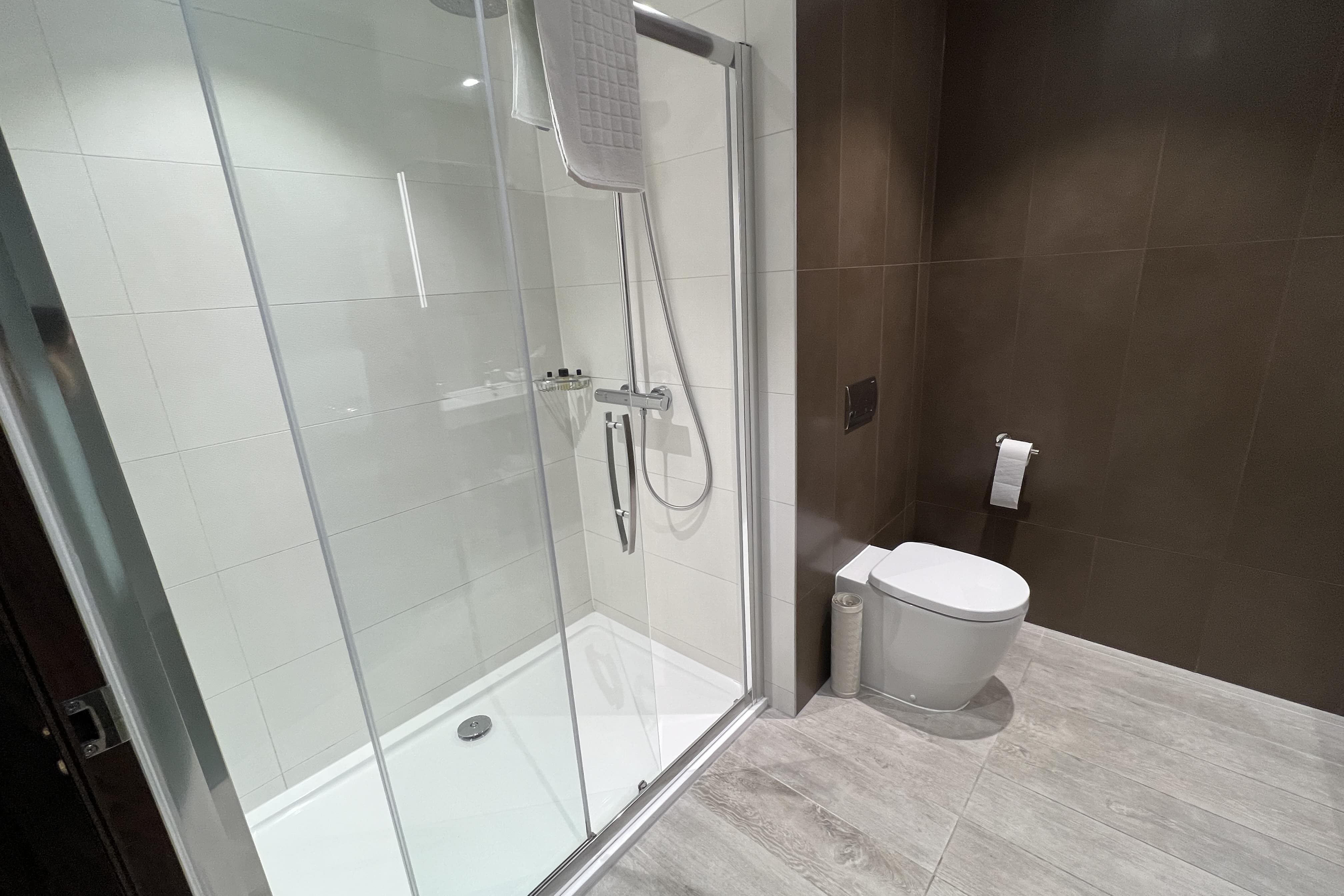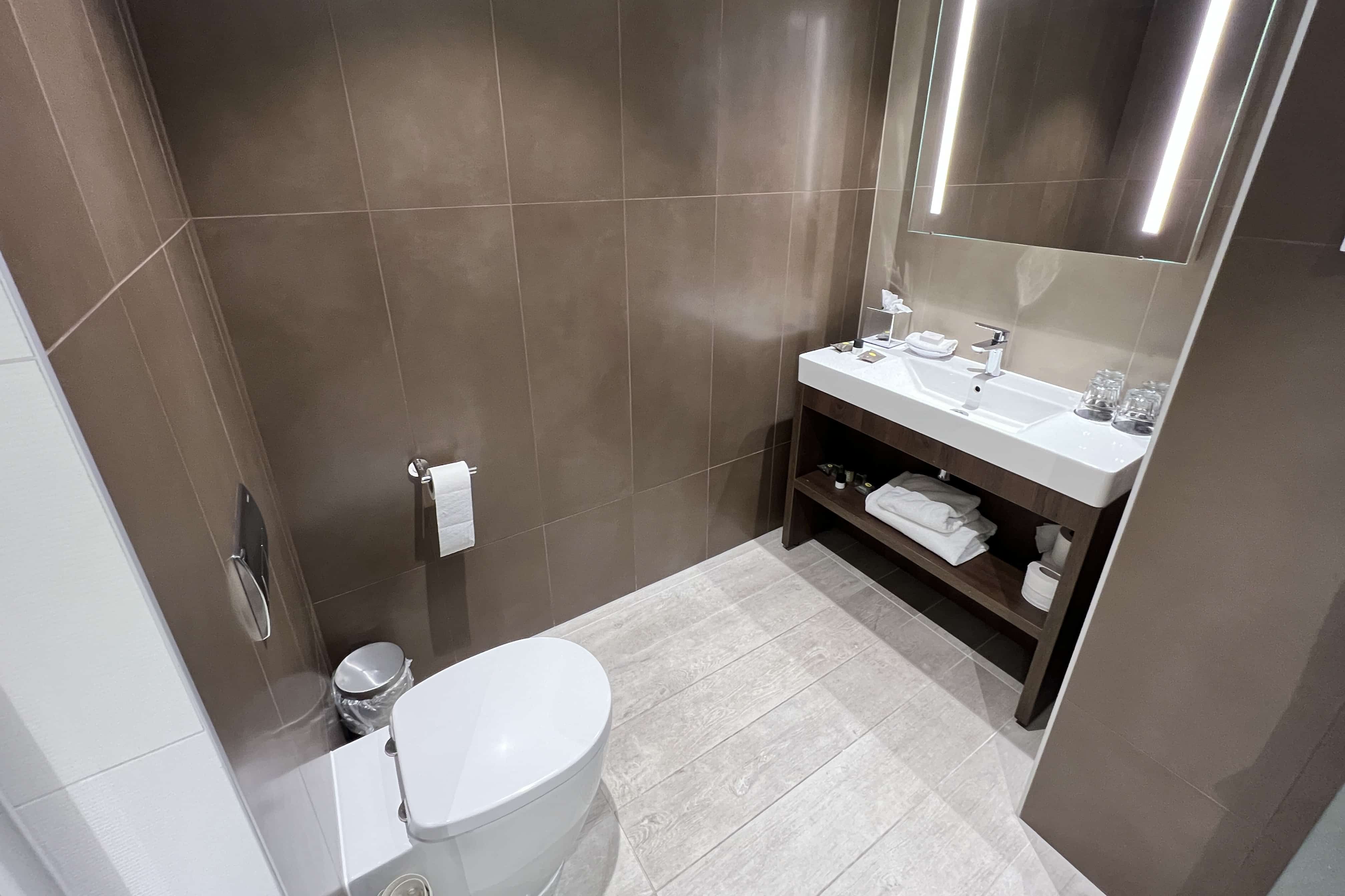 The bathroom was spacious and modern, with a shower, toilet, and single sink.
