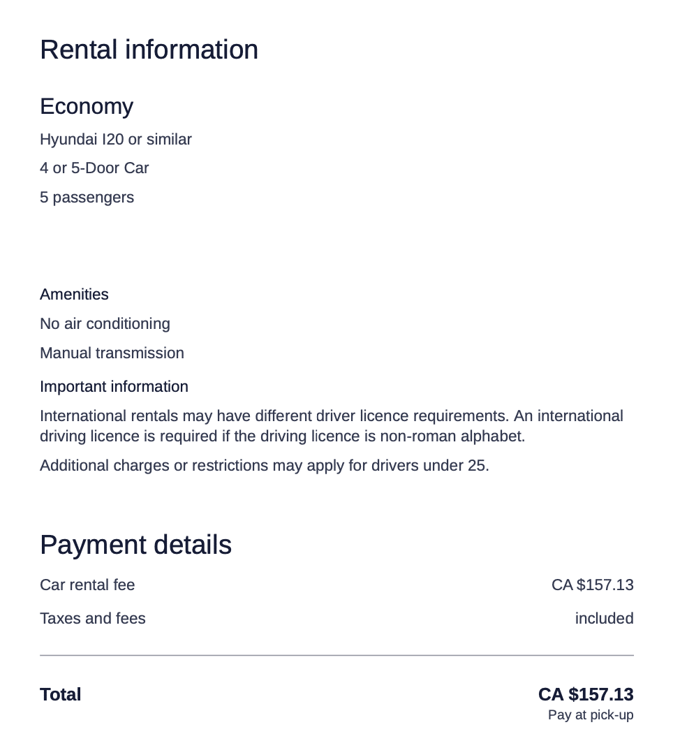 For our trip, we booked a one-day rental for $157 (CAD) with Enterprise through Expedia. Rates can be cheaper if renting for multiple days, or if you have a corporate code.