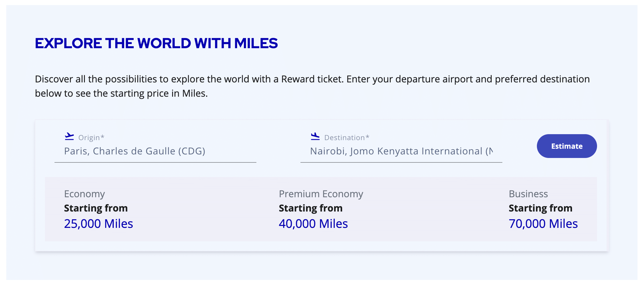 Next, I figured out what the saver prices should be for each of my segments. Using the Flying Blue miles calculator, I gleaned that Toronto to Paris should cost 50,000 miles and Paris to Nairobi (and therefore, anywhere in Europe to Nairobi) should cost 70,000 miles.