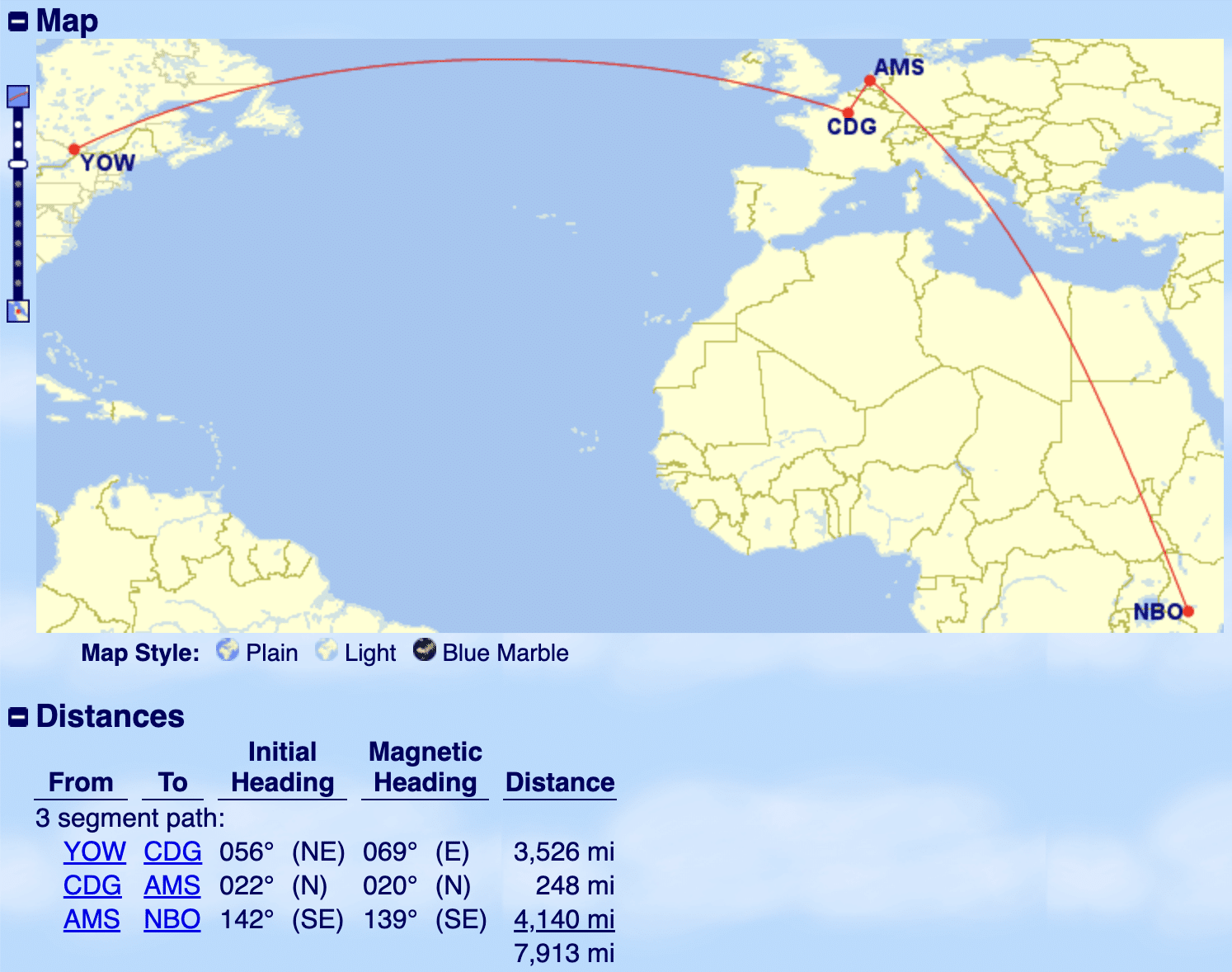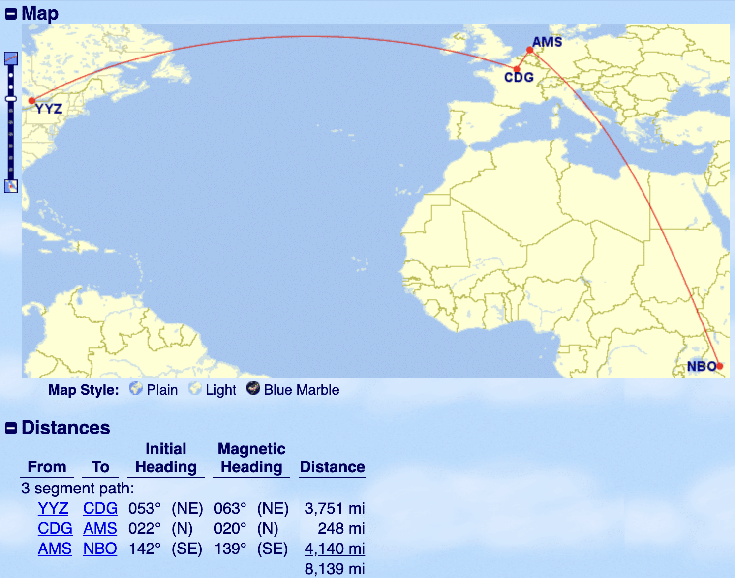 Keep in mind that the saver rate for a Toronto (YYZ) to Nairobi (NBO) flight should be 95,000 miles. This means that even though Paris–Amsterdam–Nairobi (CDG–AMS–NBO) portion was pricing out at 14,500 miles above its saver rate, the price of the total trip with the stopover came out to only 9,500 miles above what the saver price should have been.