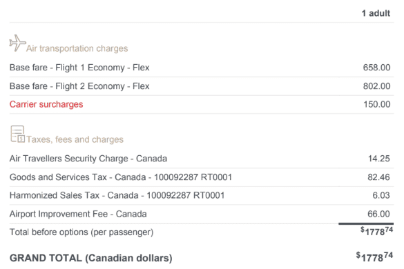 In total, my flights worked out to $1,778.74. Only $1,610, which is the base fare and the carrier-imposed surcharges, counts towards my SQD, while the other taxes and fees don’t qualify.
