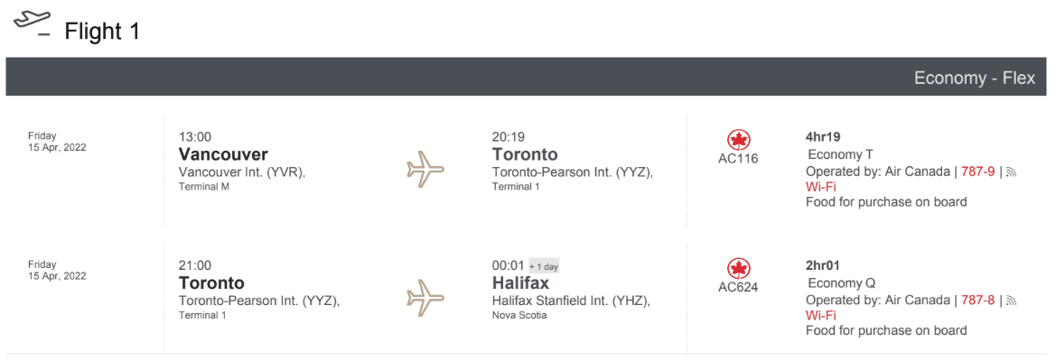 Outbound, I could fly from Vancouver to Halifax via Toronto with a lie-flat seat on both flights. Using ExpertFlyer, I found eUpgrade space on both flights, a quick connection time in Toronto, and the cash fare worked out to be almost exactly what I was hoping to see.