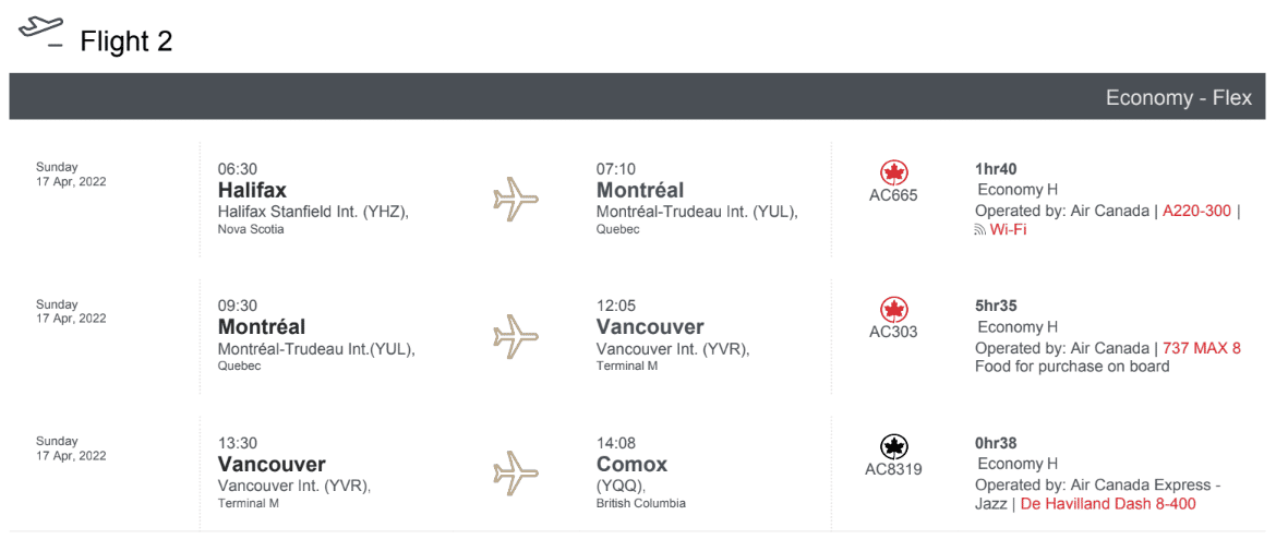 Coming back, I had to consider that the flight from Vancouver to Comox departs at 1:30pm. In this case, the time difference of four hours between Comox and Halifax works in my favour.