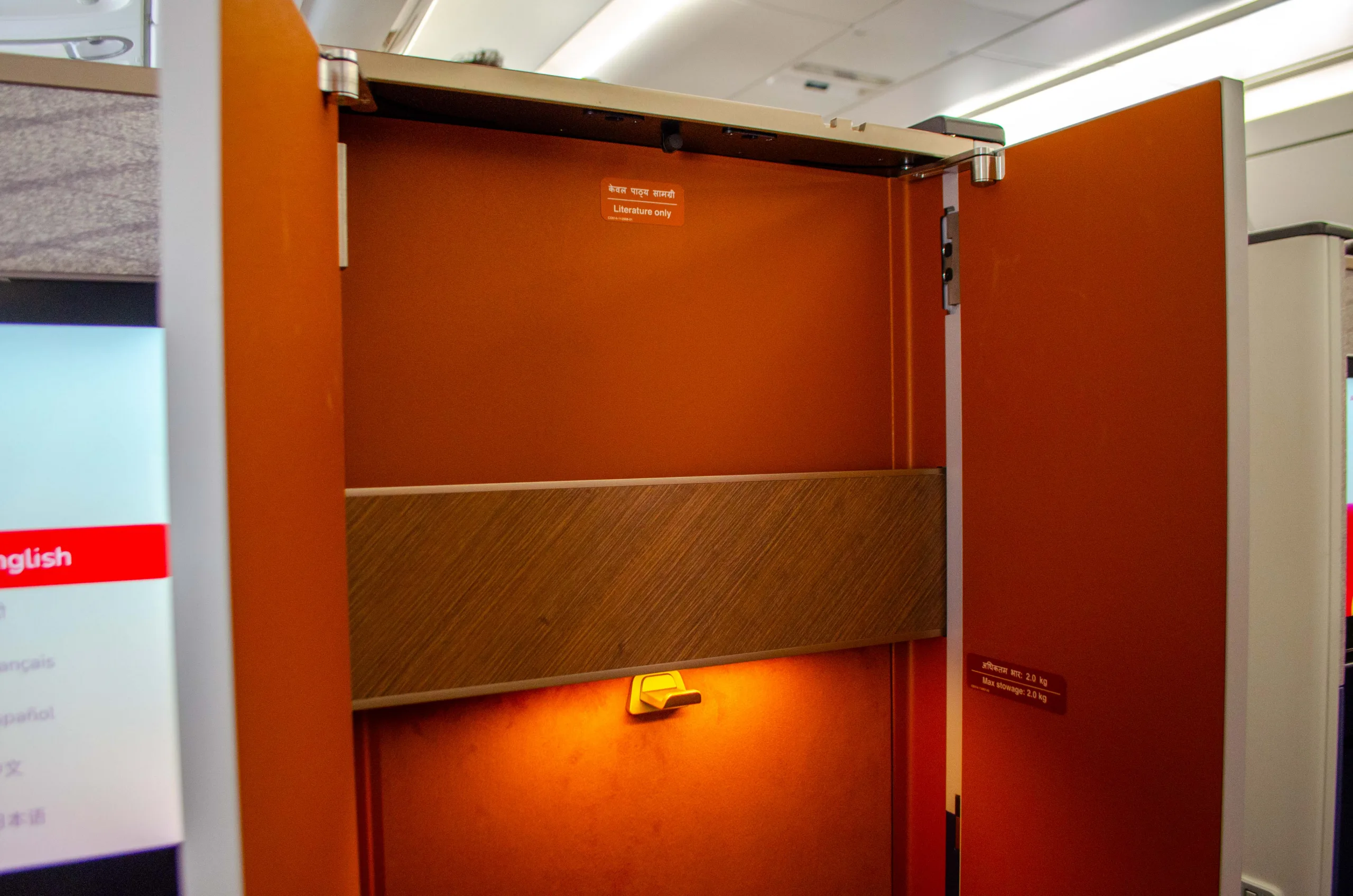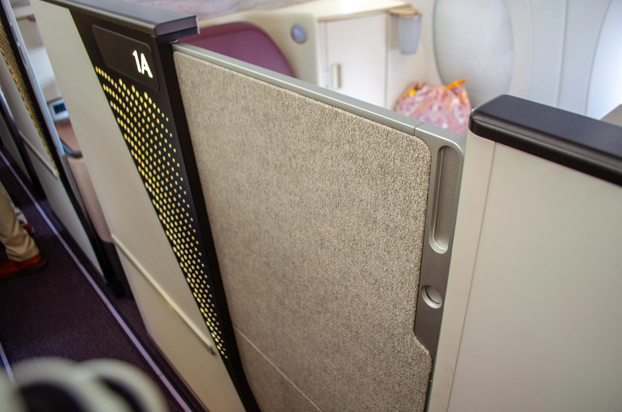In the middle of the cabin, odd-numbered rows are set in a “honeymoon” configuration, with the seats nestled close to each other. If you’re travelling with a partner, you can open up a sliding door to enjoy the flight together.