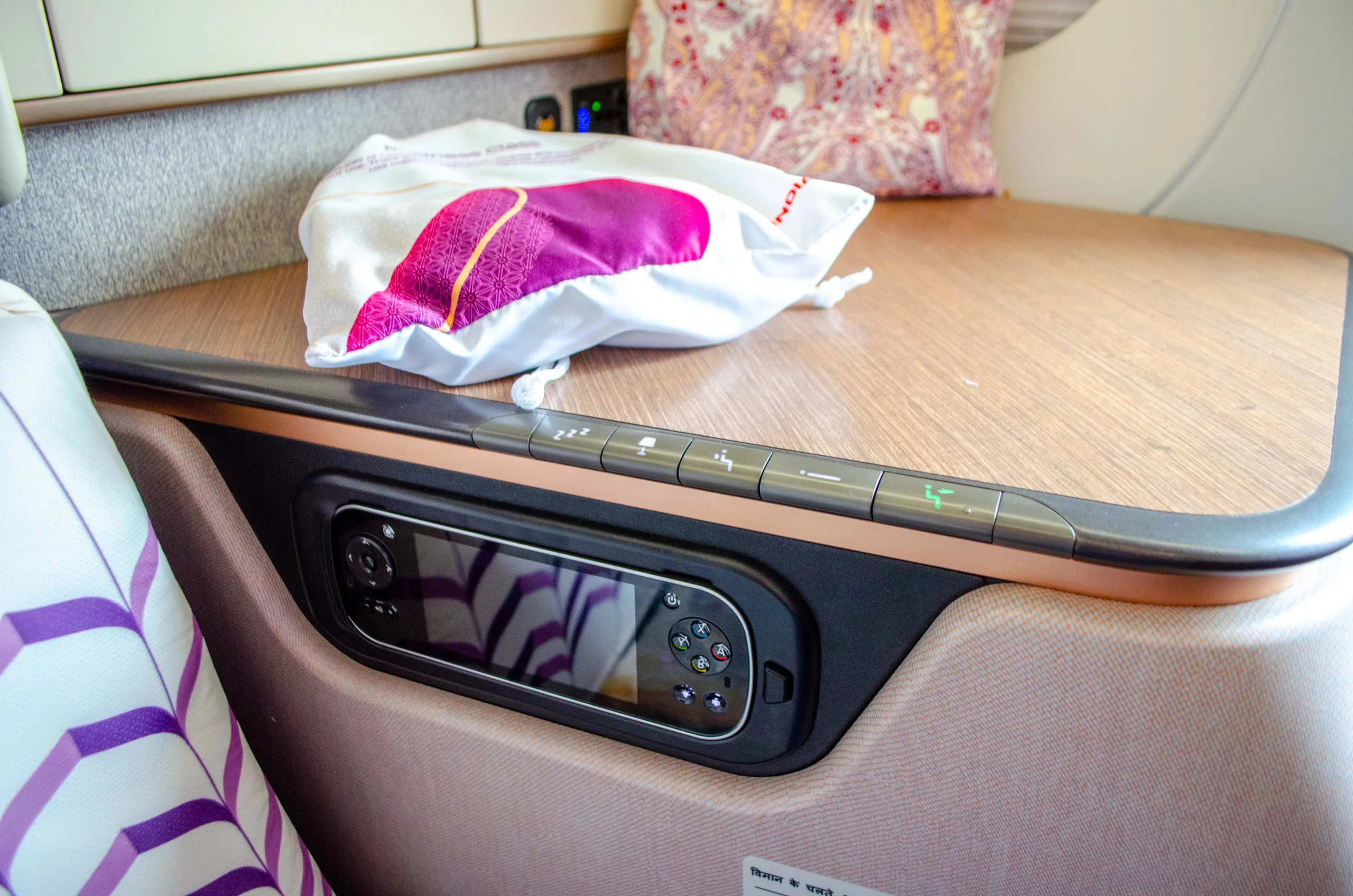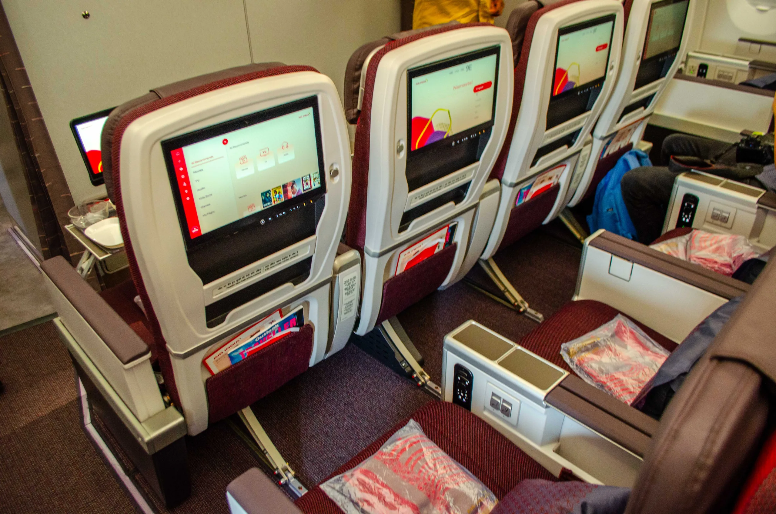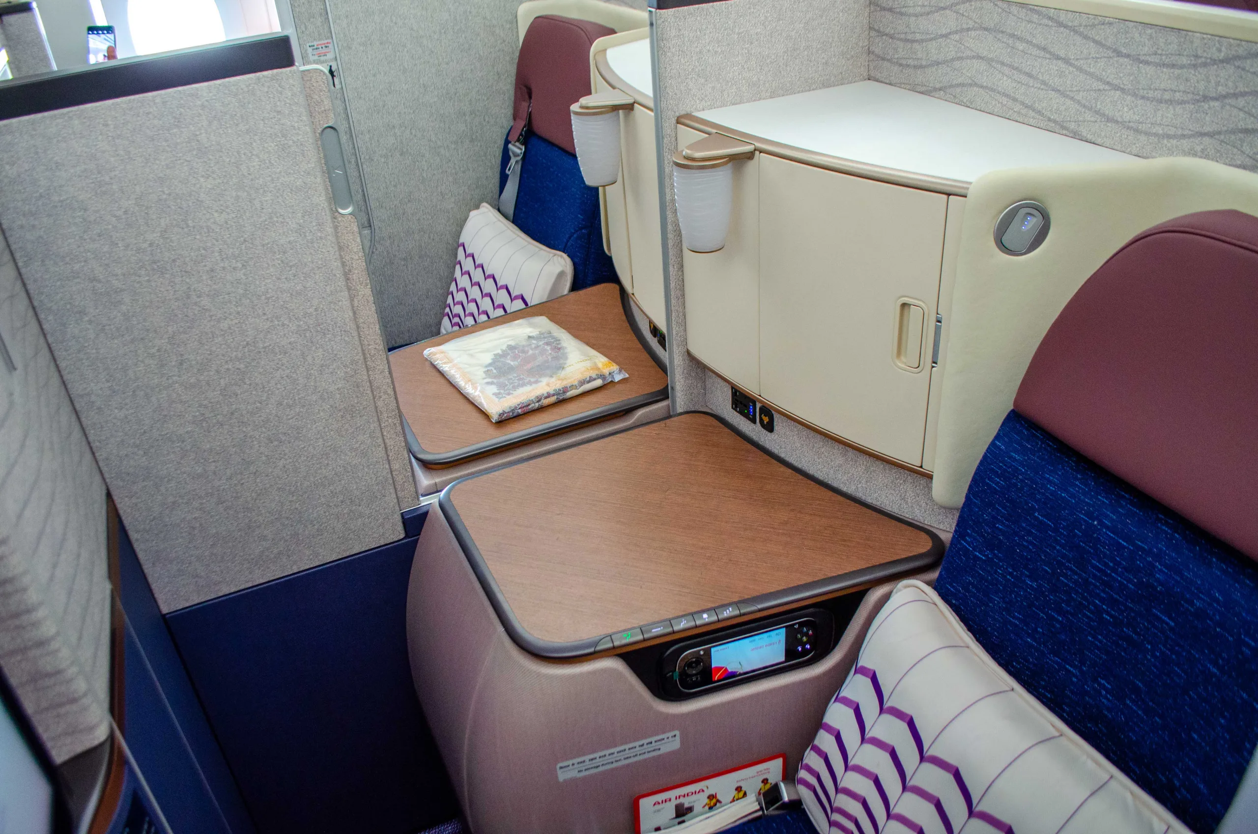 The seat reclines into a fully lie-flat bed. As part of the launch, Air India has also introduced new bedding and amenities, which we’ll feature in a separate article.