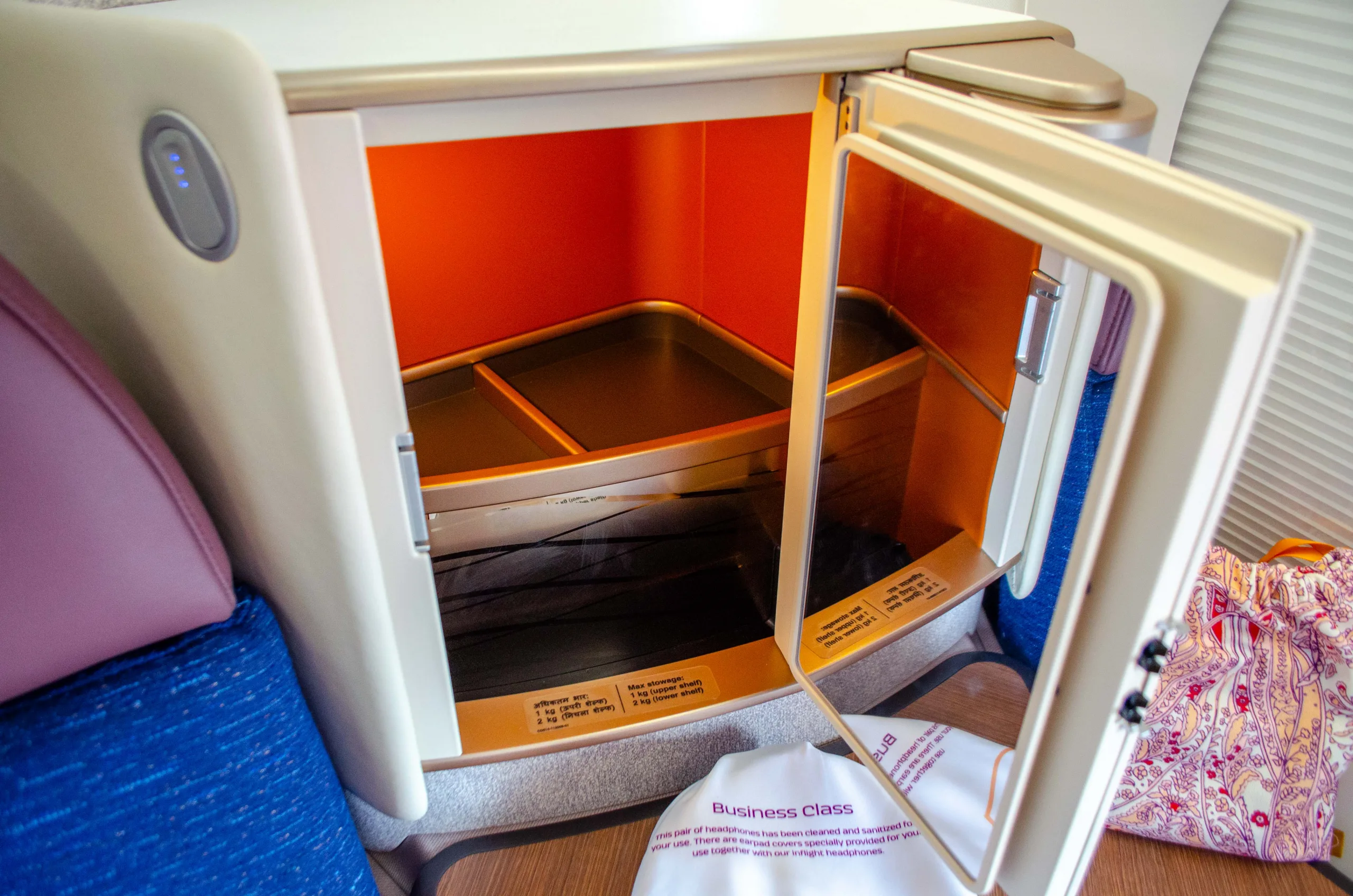 Each suite features a wardrobe for storage of garments, as well as separate storage space for shoes. Air India provides business class passengers with slippers for long-haul flights.