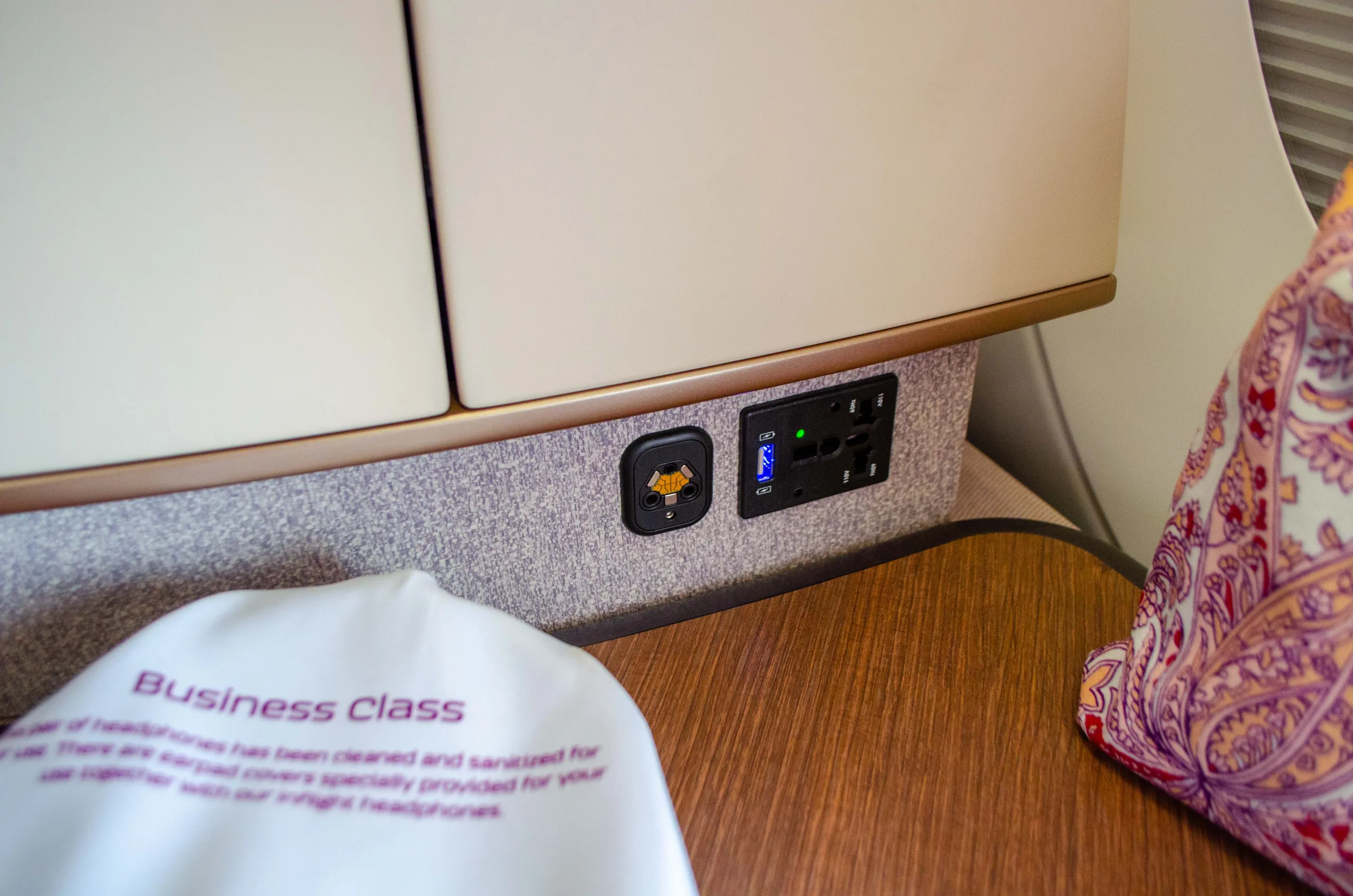 A USB-A and universal power outlet are located under the cabinet, just behind the flat wooden surface space to the side of the seat.