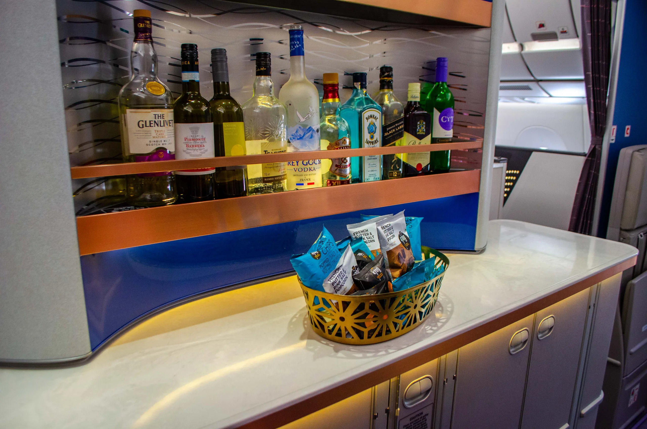 At the rear of the cabin, between business class and premium economy, is a lounge area. During the initial walkthrough, it featured snacks and a variety of liquor.