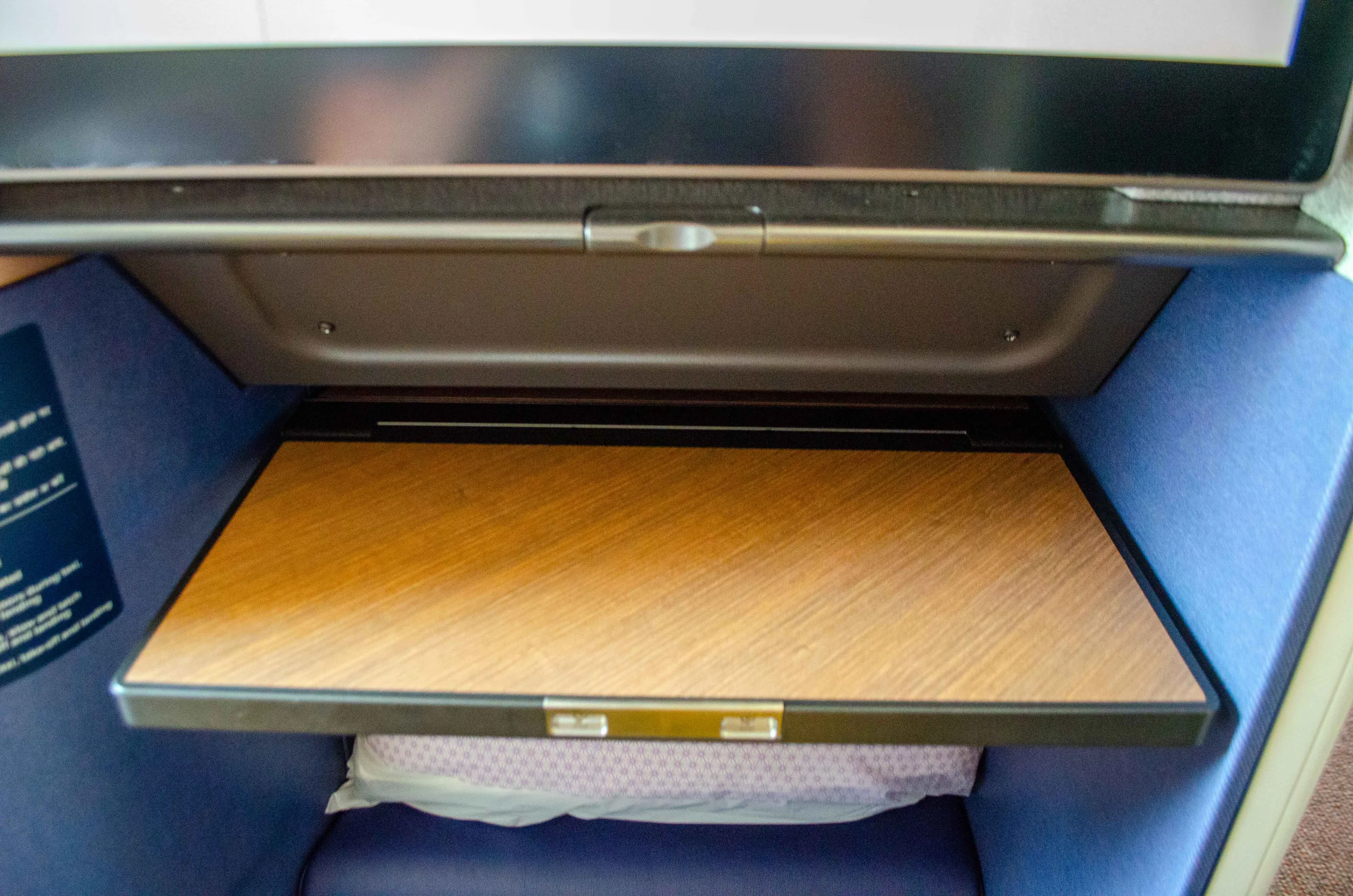 The tray table slides out from underneath the 21-inch entertainment screen, and it can fold backwards onto itself for a smaller surface space.