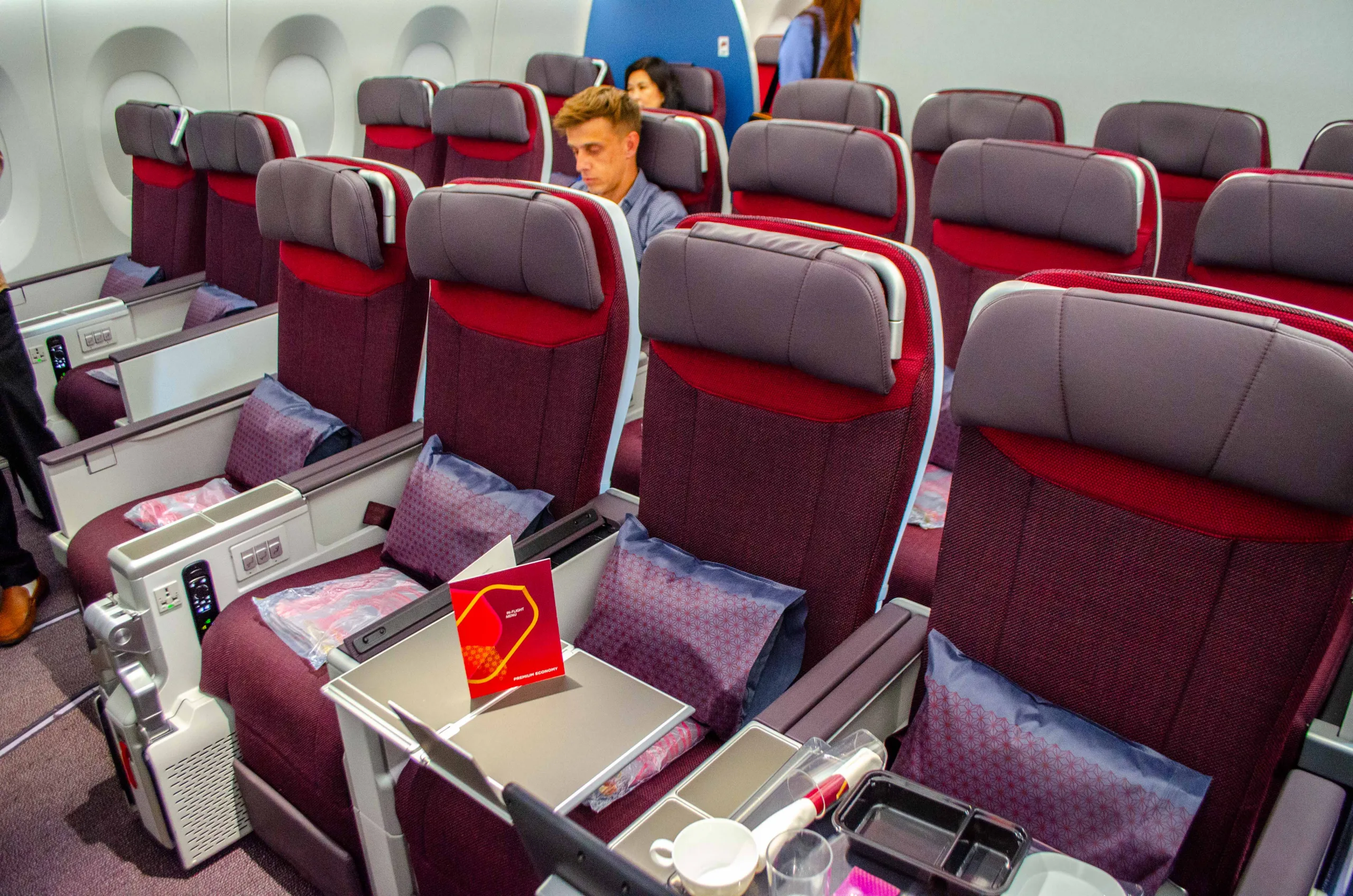 Unlike the new business class cabin, the premium economy cabin features a primarily aubergine colour palette, with red accents on the seats and bedding.