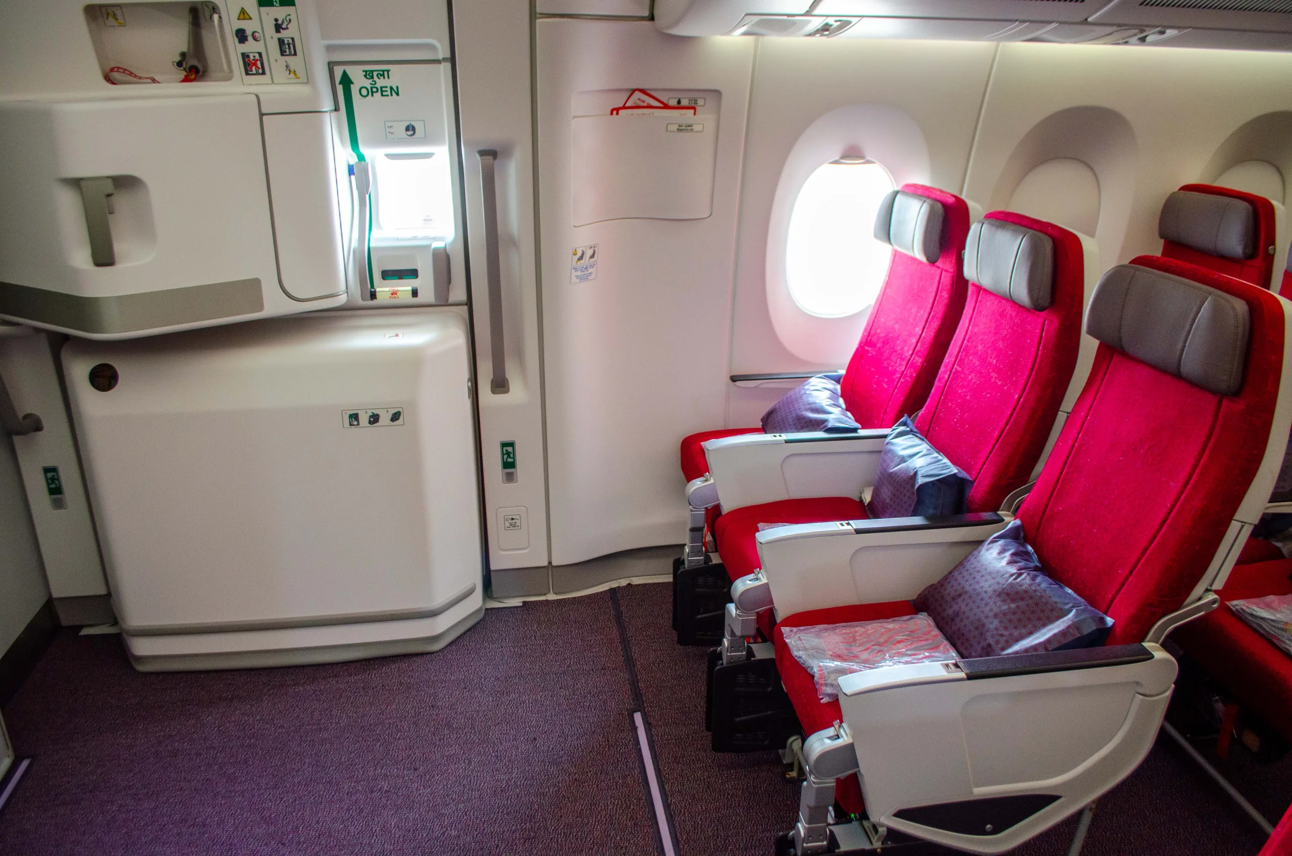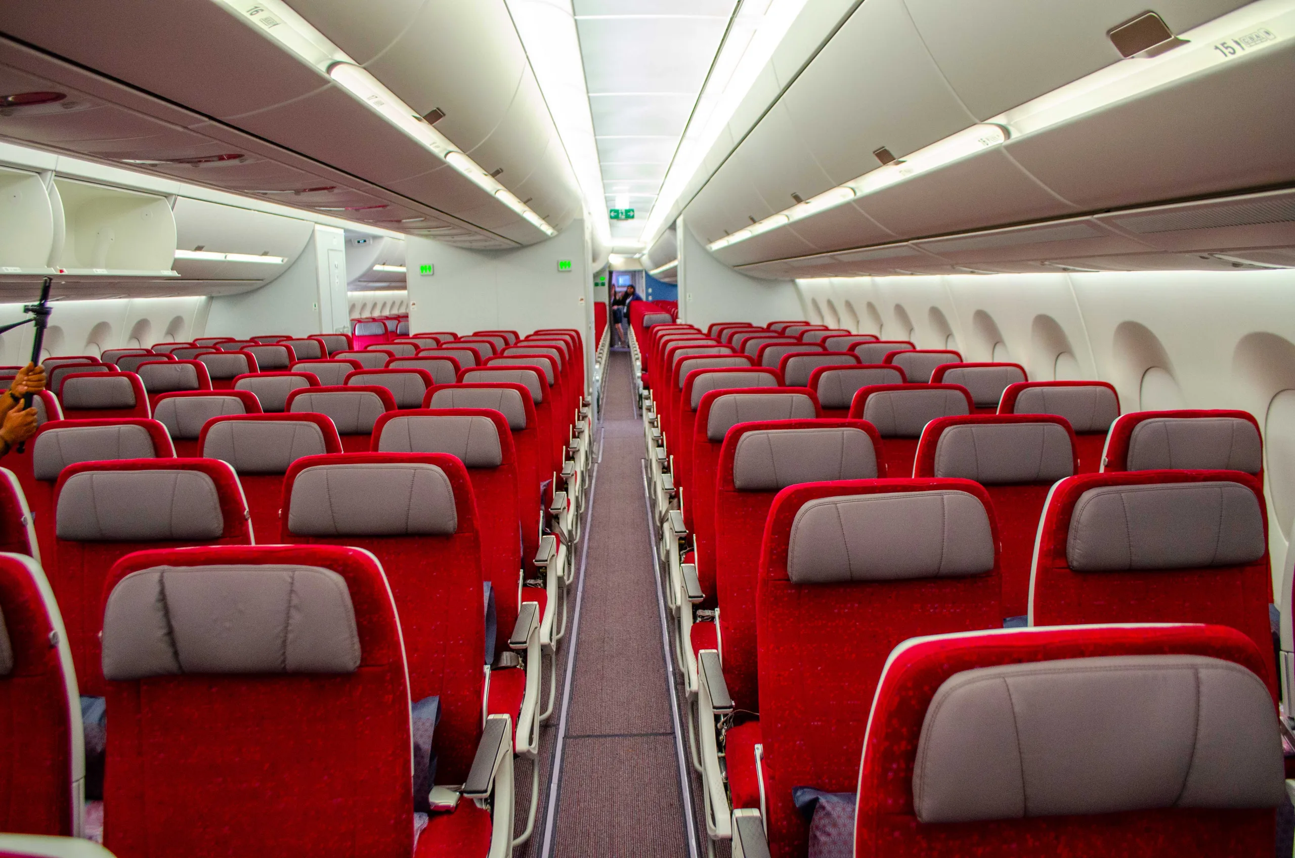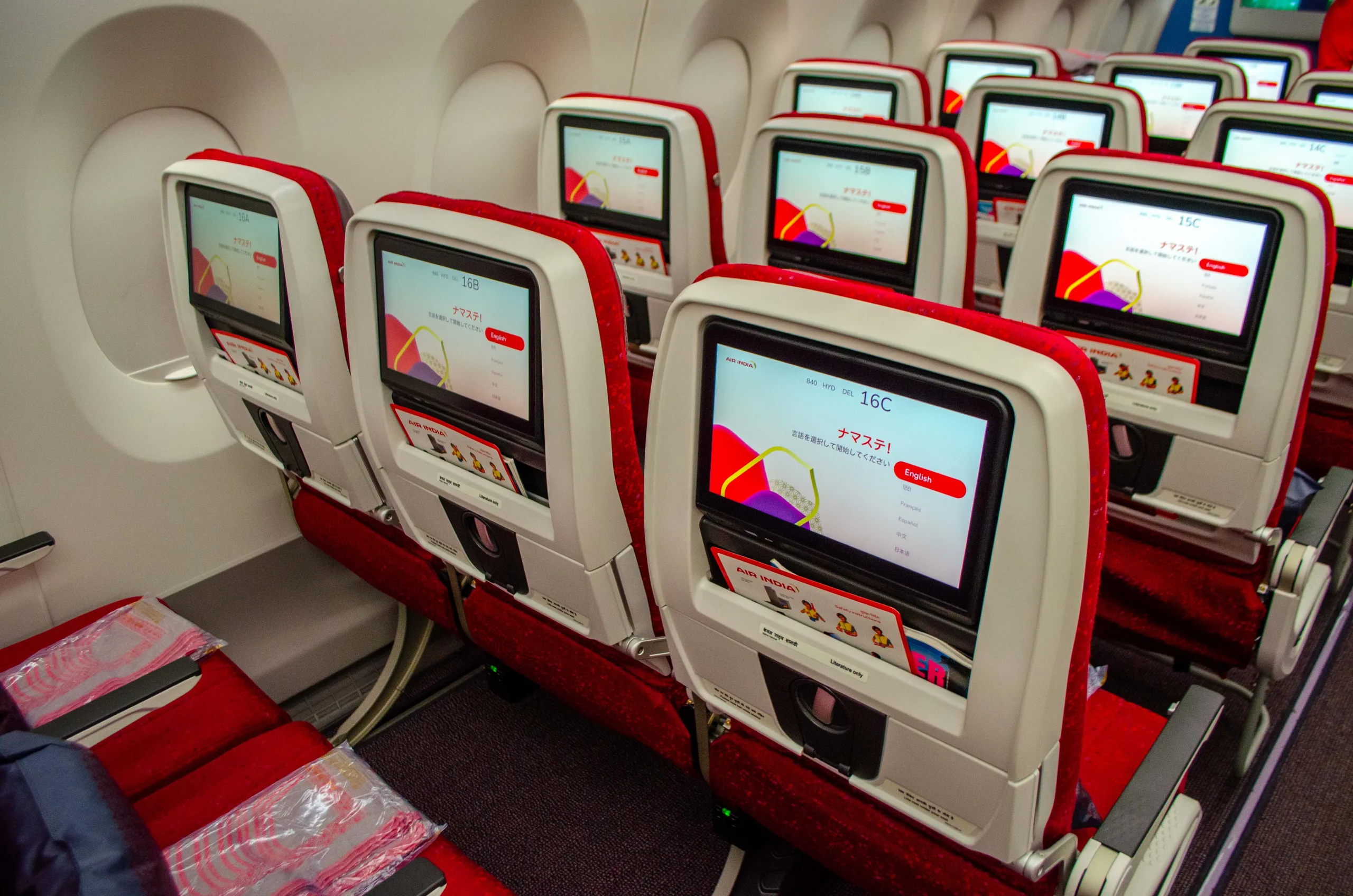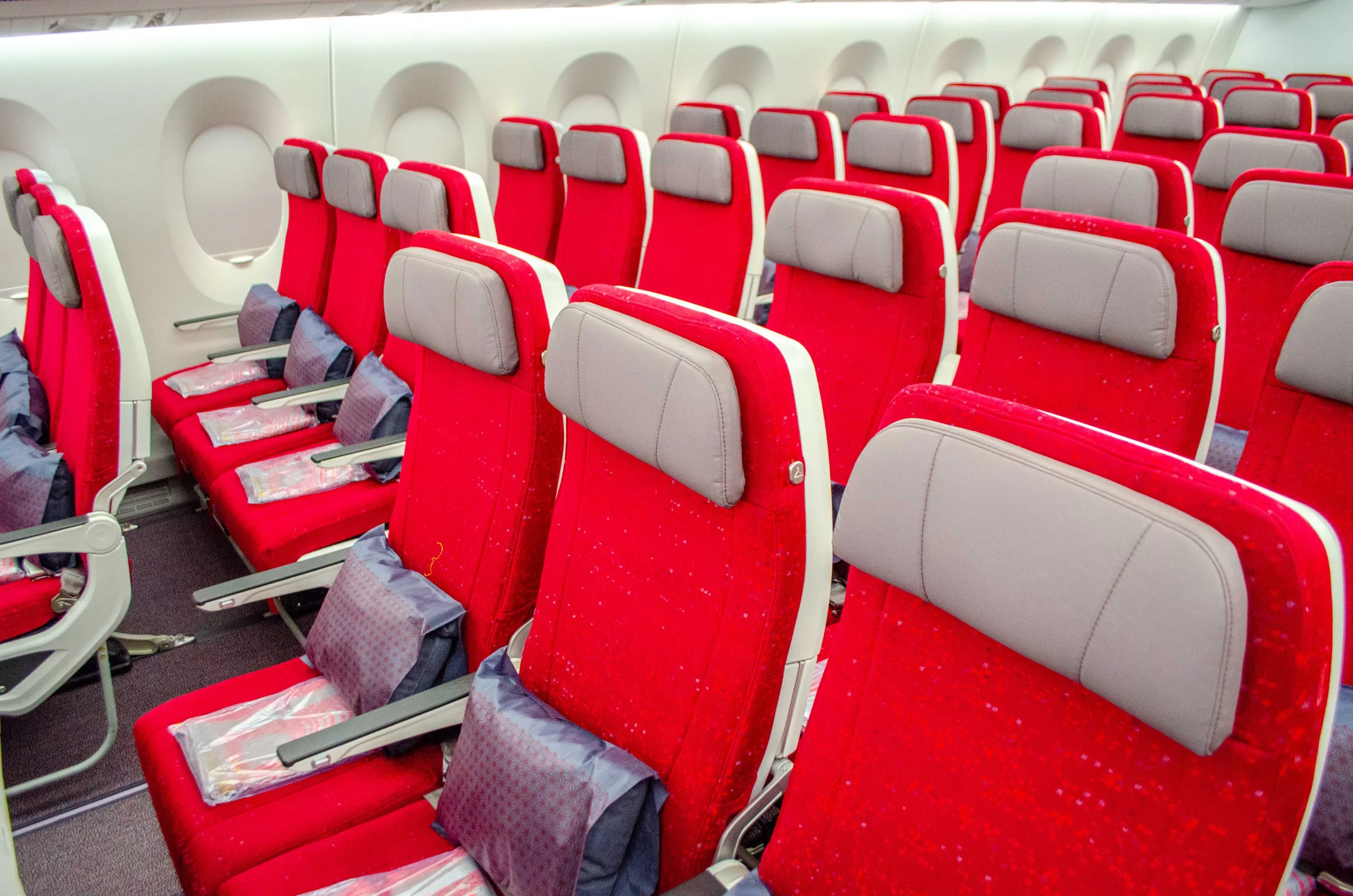 The colour palette in the economy cabin is made of bright red hues with grey accents.