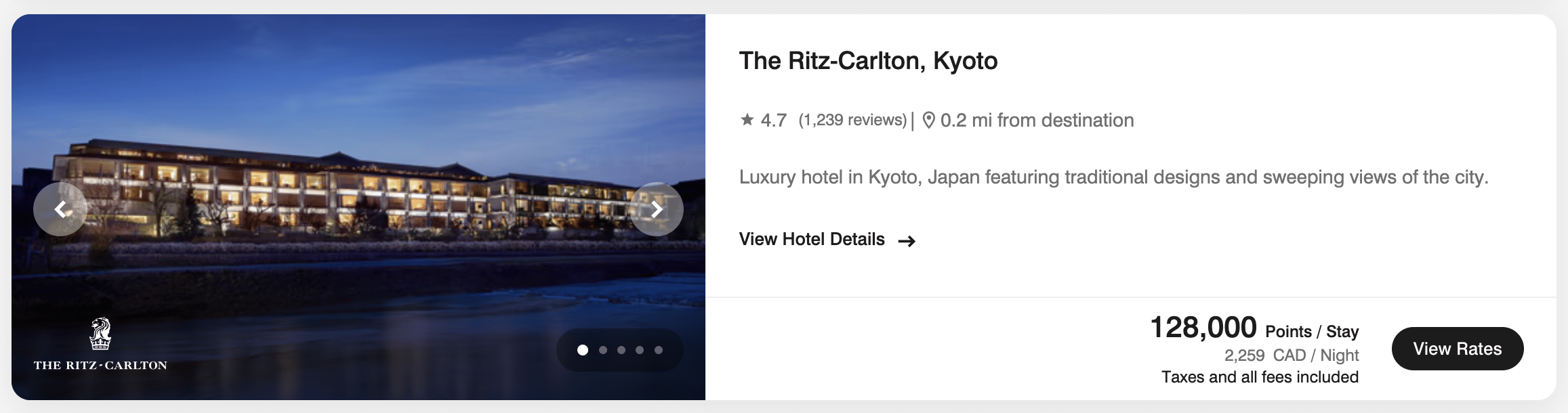 However, Marriott Bonvoy points can still make sense in cases where cash rates are extremely high compared to award pricing. A property like the Ritz-Carlton Kyoto, where cash rates regularly exceed $2,000 per night, might still be a reasonable redemption at 128,000 points, yielding about 1.76 cents per point in value.