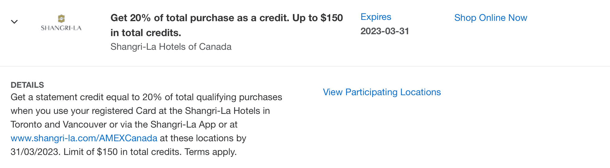 Recent Amex Offers include statement credits with United Airlines, Air France/KLM, Shangri-La Hotels and Resorts, Marriott Bonvoy-affiliated properties in Canada, and Fairmont hotels in Canada.