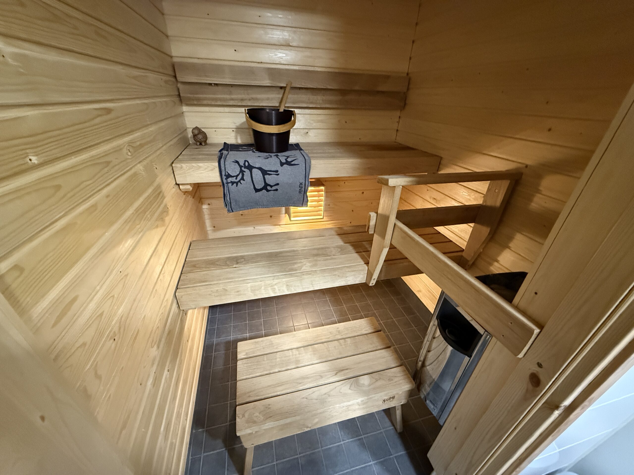The cottage was immaculately clean and designed in a simple Scandinavian style. It was spacious, with a loft, two bathrooms, two bedrooms, and enough beds for up to eight guests. It offered a very comfortable stay, with a dining area, living room, kitchenette, and even a sauna.