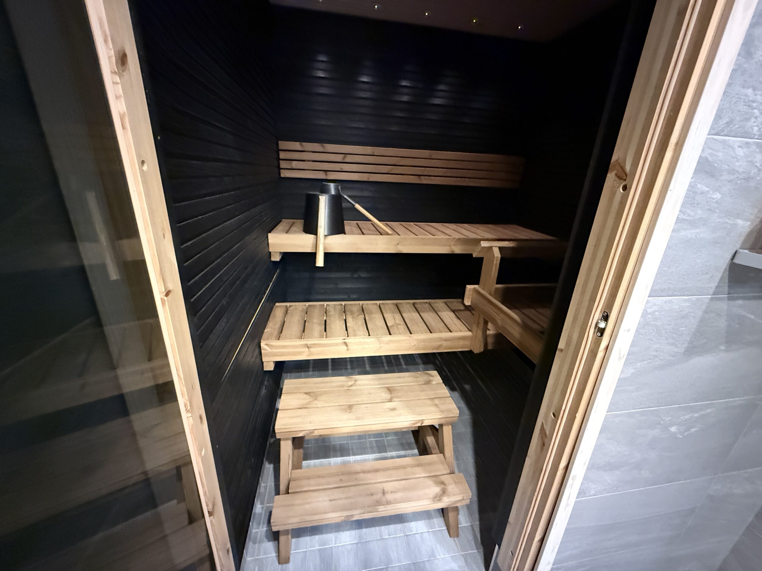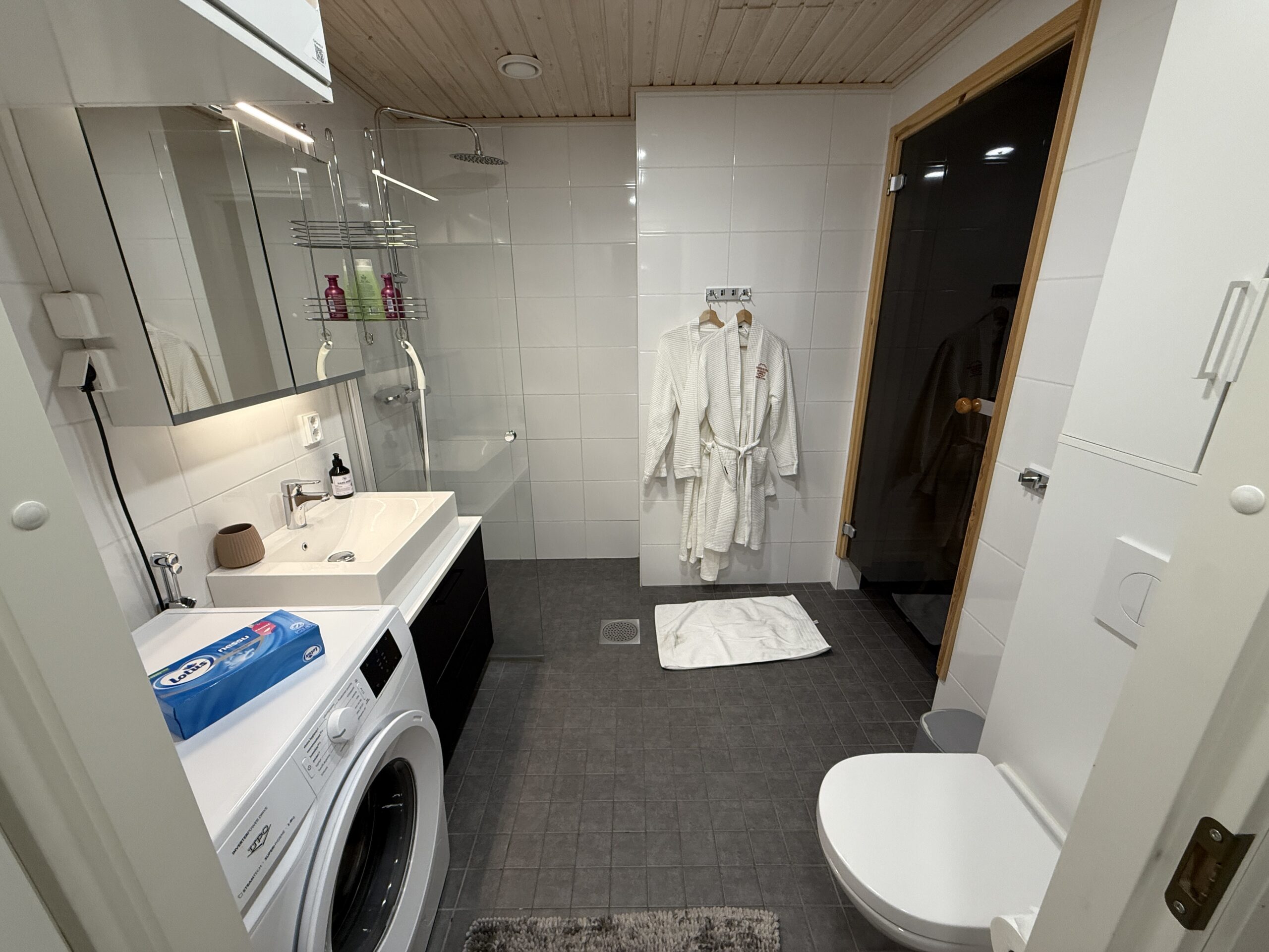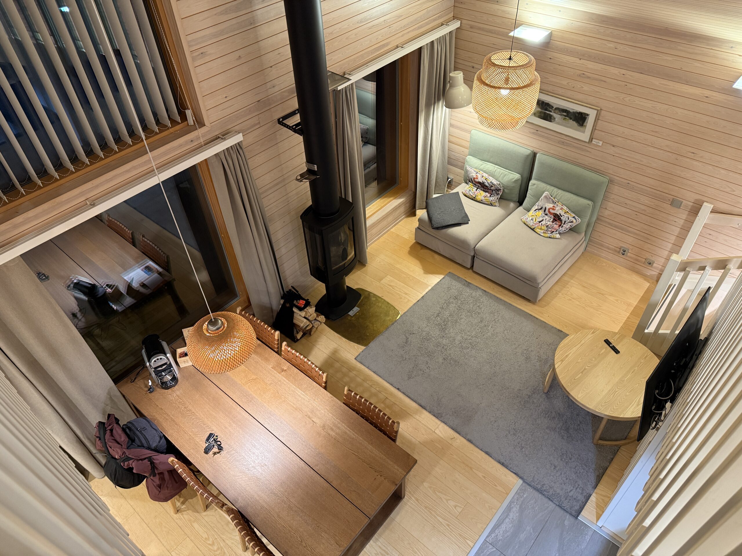 The cottage was immaculately clean and designed in a simple Scandinavian style. It was spacious, with a loft, two bathrooms, two bedrooms, and enough beds for up to eight guests. It offered a very comfortable stay, with a dining area, living room, kitchenette, and even a sauna.