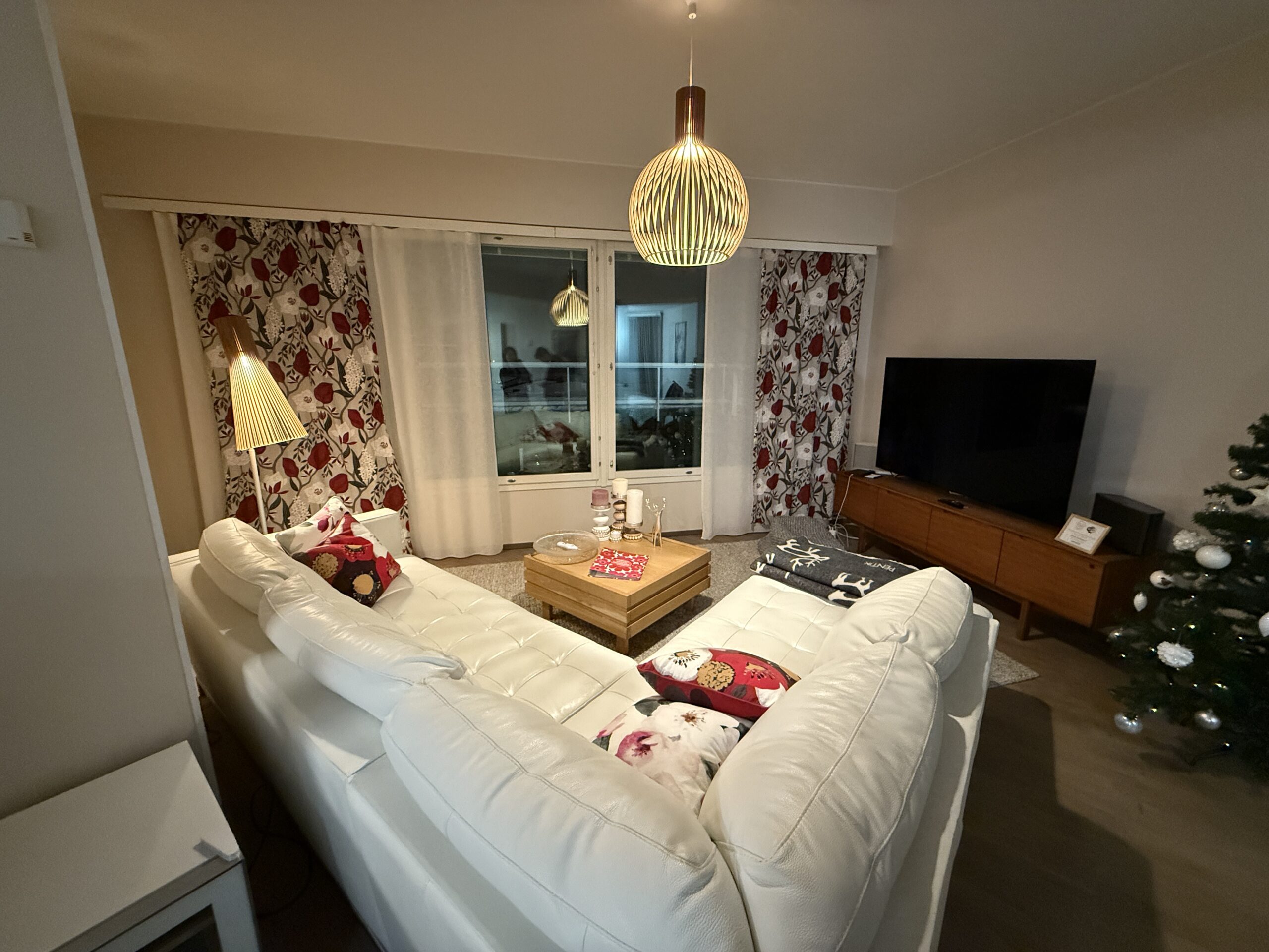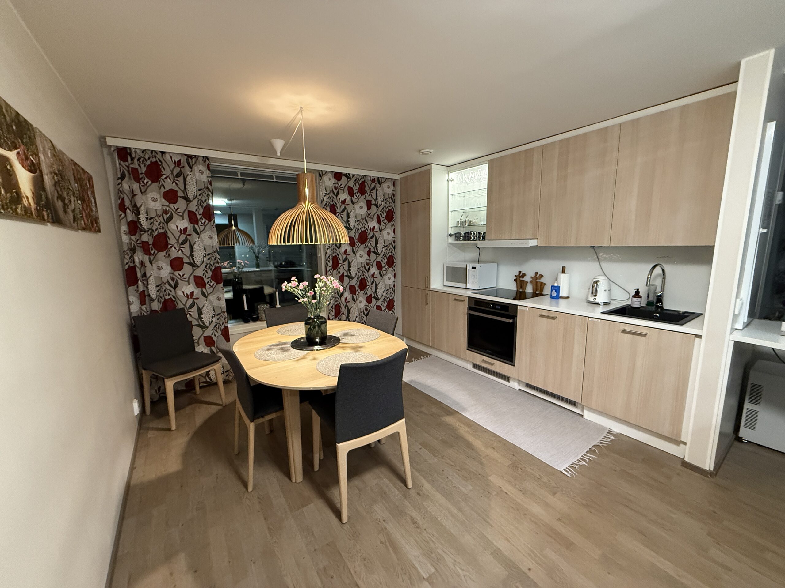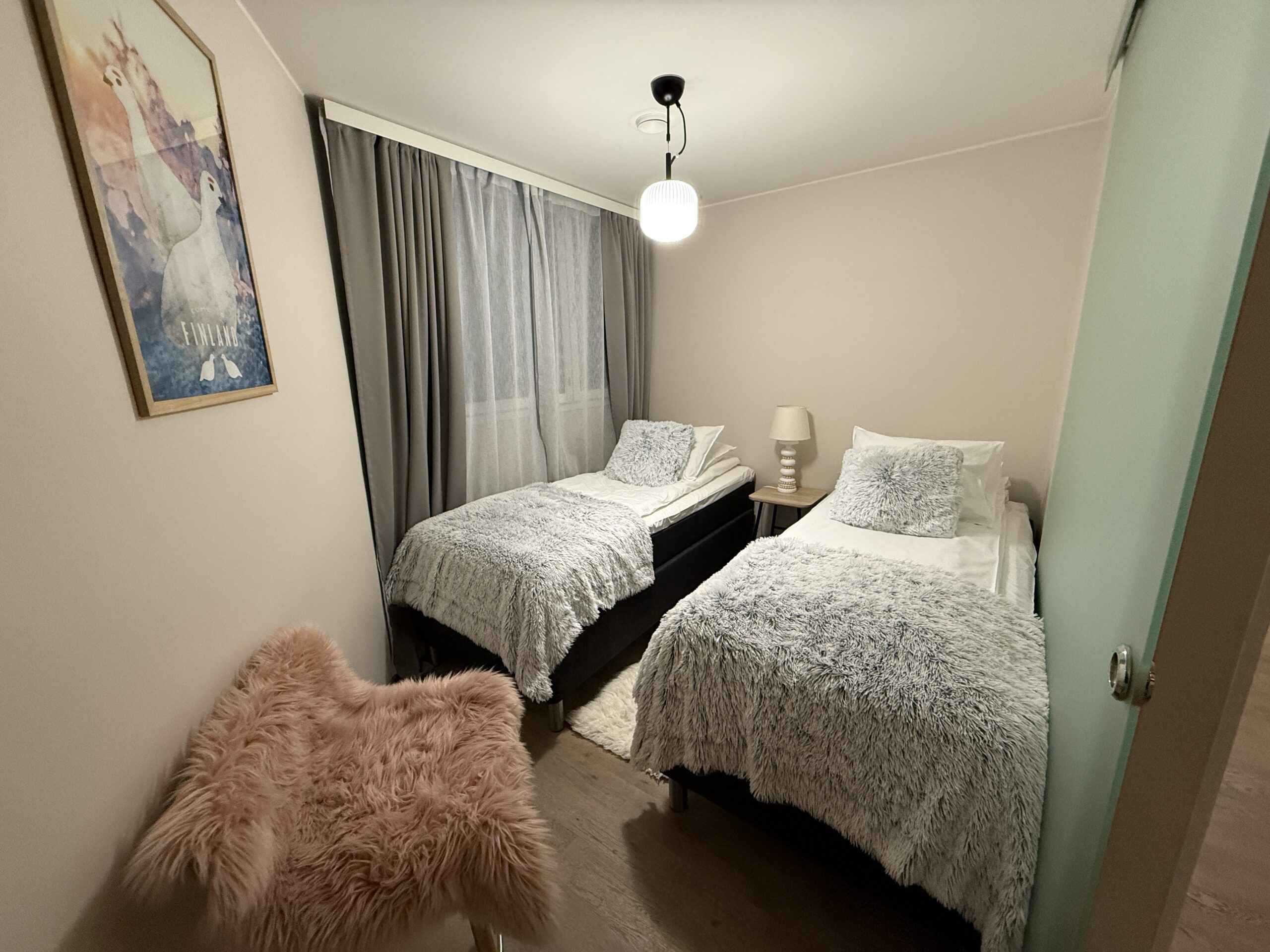 The cottage was immaculately clean and designed in a simple Scandinavian style. It was spacious, with a loft, two bathrooms, two bedrooms, and enough beds for up to eight guests. It offered a very comfortable stay, with a dining area, living room, kitchenette, and even a sauna.