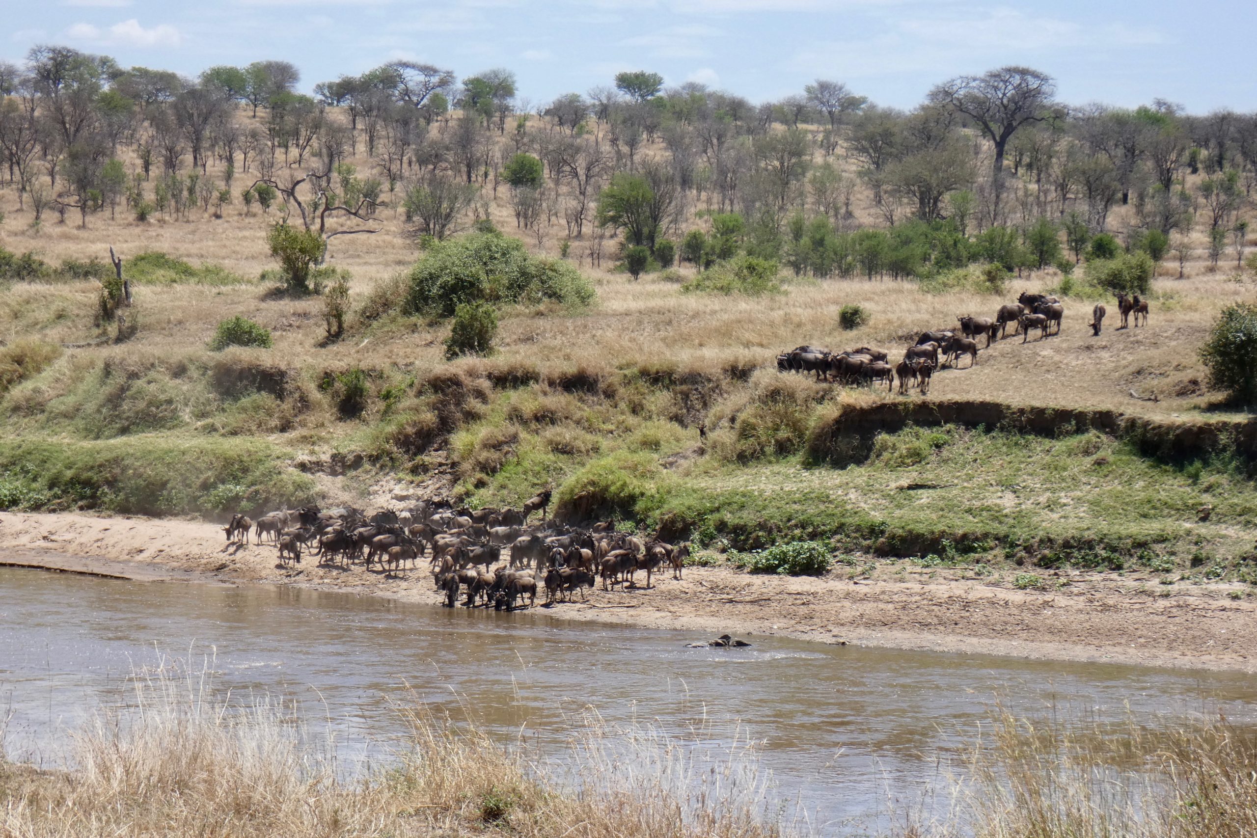 There were a couple of herds of wildebeest at the water’s edge, but they weren’t moving. All the guides knew to stay well out of sight to minimize any distraction that may deter them from crossing. Once one wildebeest leads the way, inevitably, the rest would follow.
