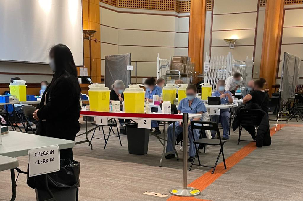 Looking around the auditorium, tables were set up on one side into six vaccination stations. On the other side were maybe a dozen chairs spaced out.