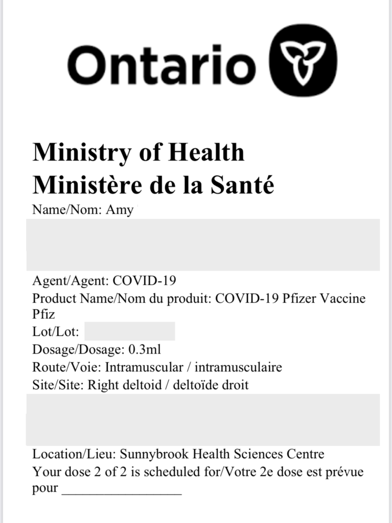 By the time I had walked back to my car, I had received two emails, one from Sunnybrook with details of my second vaccination appointment and the other from the Ministry of Health with a digital record of my immunization.