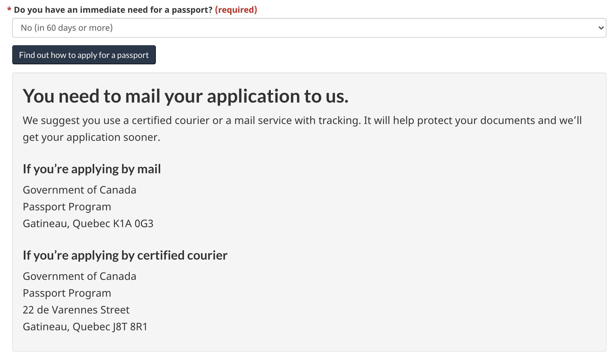 Meanwhile, if you don’t require passport services immediately (for example, your current passport is nearing expiry and you’d like to get it renewed, but you don’t have travel plans within the upcoming two months), then you’ll be invited to submit your application by mail.