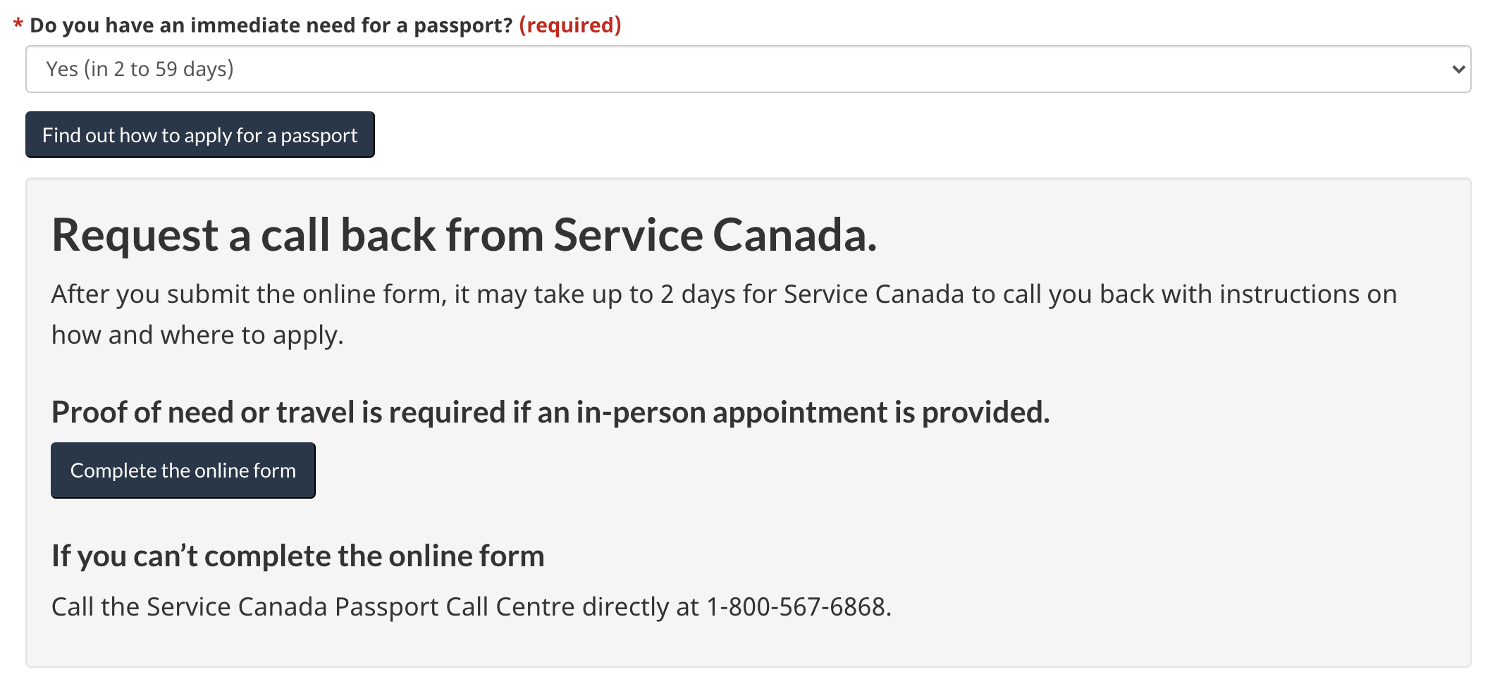 If you require passport services “immediately” but not urgently (defined as within two to 59 business days), you’ll be invited to request a callback from Service Canada. Again, you’re reminded that you’ll need to present proof of need or upcoming travel.