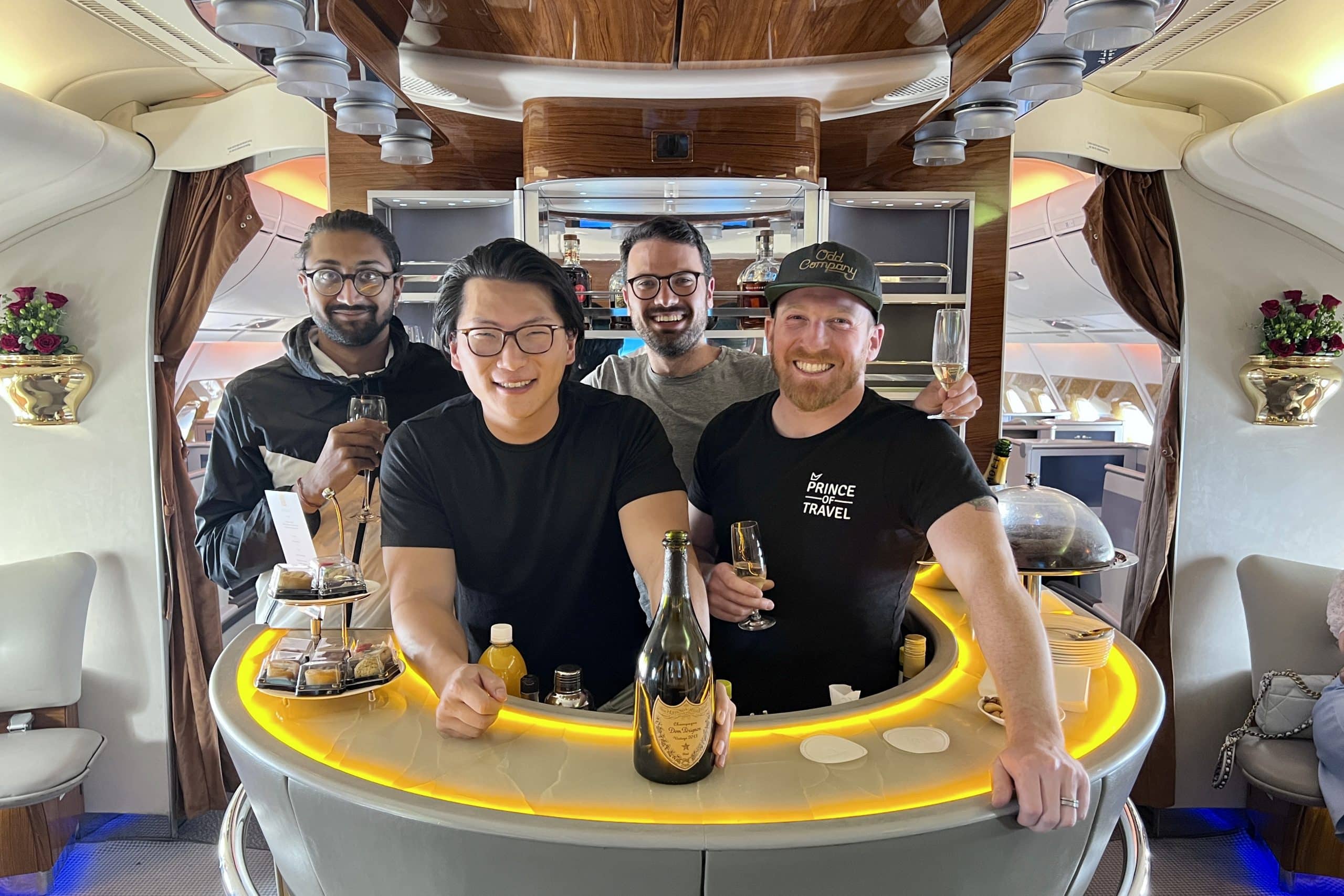 Meanwhile, Josh, T.J., and Rohin headed to the bar to sip on their first two glasses of Moët & Chandon prior to takeoff. It was all three of their first times experiencing the Emirates bar and checking off this aviation bucket list item, and I’m sure that the shared experience made it all the more special.