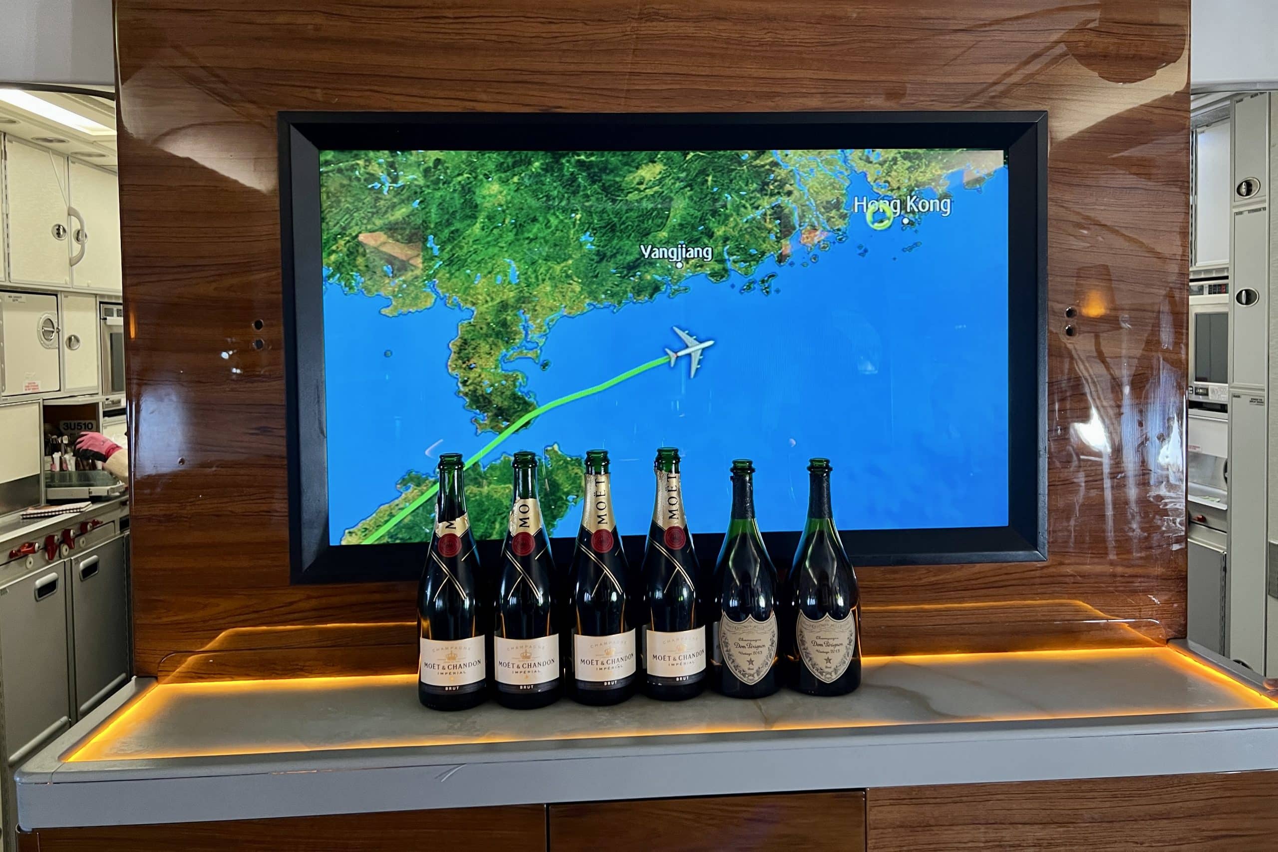 Emirates First Class passengers can order Dom Perignon at the bar, but business class passengers can only order less expensive Champagnes: Veuve Clicquot on routes to Europe and the Americas, or Moët & Chandon on routes to the rest of the world.