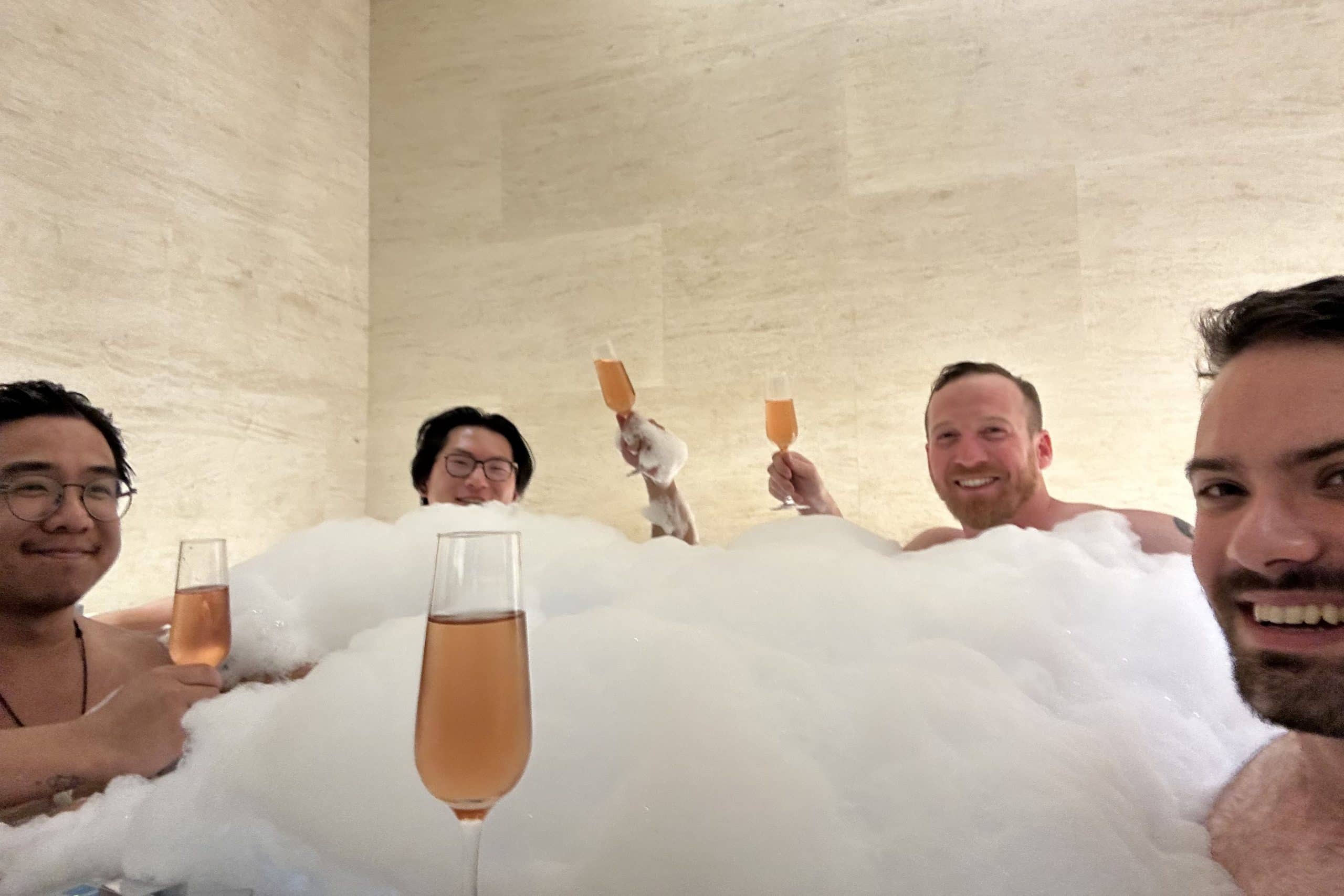 Ricky, on the other hand, a seasoned veteran of premium award travel, wasted no time in dumping a bottle of shampoo into the water, creating a makeshift bubble bath to complement the bubbles in our champagne flutes.