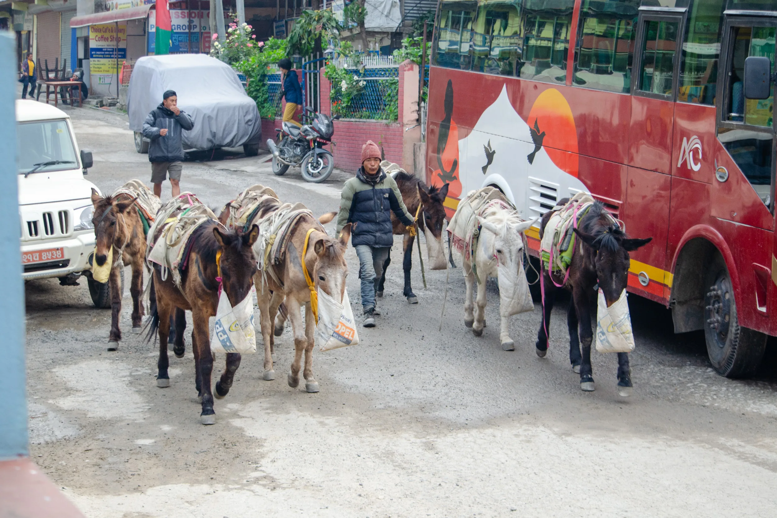 As we sipped on coffee and masala chai, we watched a drove of donkeys get loaded up with supplies, while the Italian group, looking a bit worse for wear, loaded up into a bus back to Kathmandu.