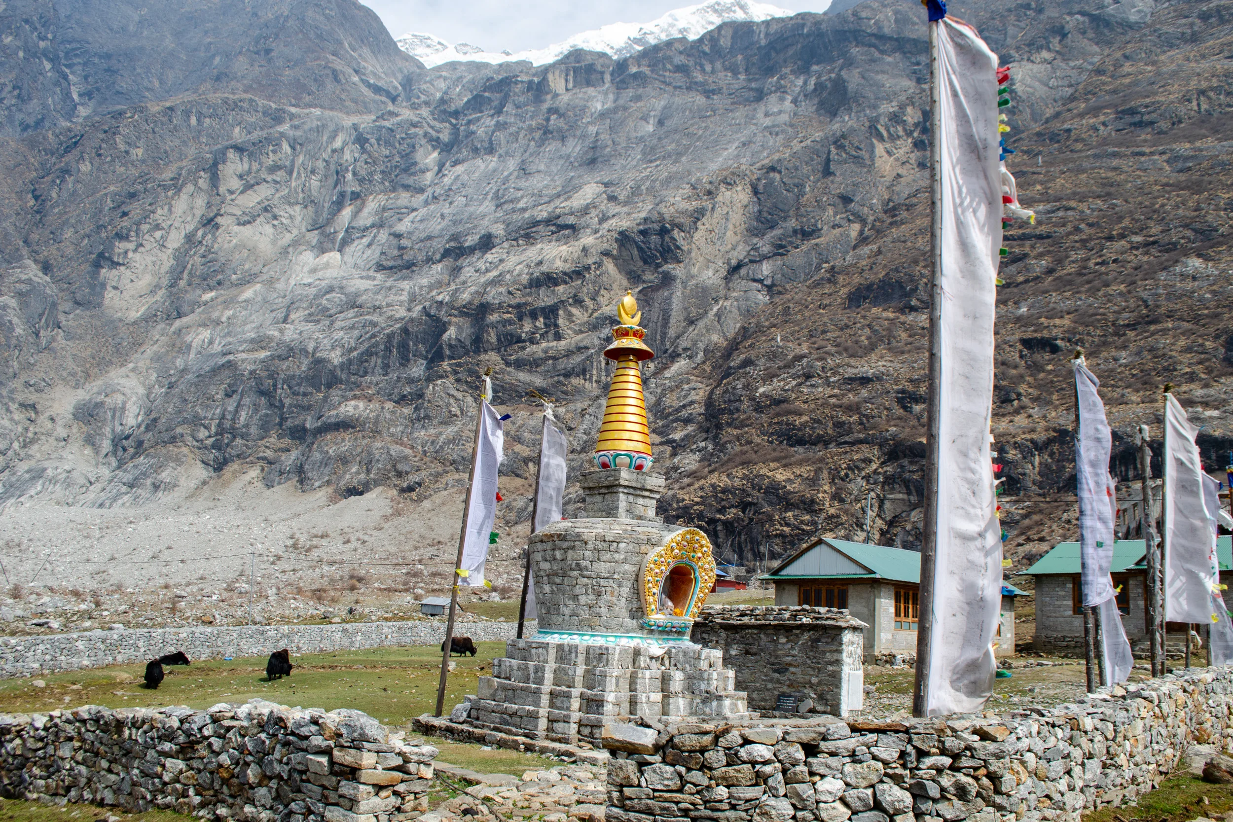 As Ashley rested, I explored the village, and wound up watching the local yaks graze for the latter part of the day. In the distance, we caught our first glimpses of 7,000+ metre peaks, which I hoped we’d get to see close.