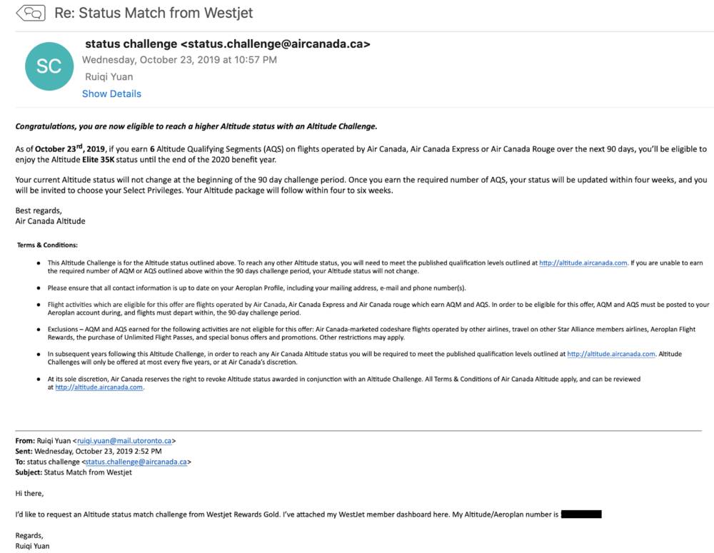 While I’m normally very Miles & Points-oriented only, there was an interesting status challenge article on the blog saying I could match my WestJet status to Air Canada Altitude and earn either Prestige 25K or Elite 35K status after meeting the challenge requirements.