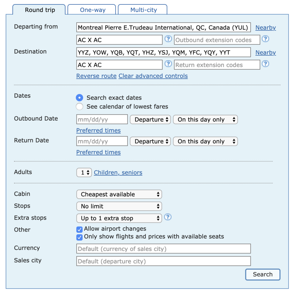 You’ll want to use the “Advanced controls” feature to specify the operating carrier (Air Canada) and the number of segments required. If you’re looking for a four-segment run for Prestige 25K, you’d enter “AC X AC” in the advanced routing codes to specify that you need two segments in each direction.