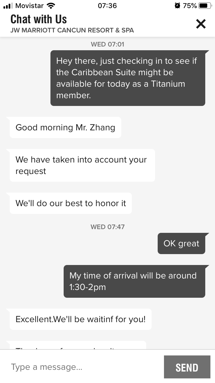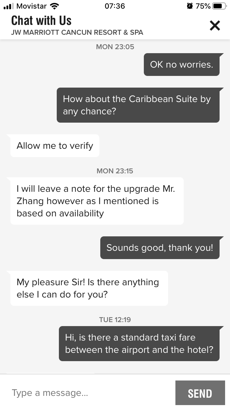 Indeed, the chat agent replied by saying that they’d leave a note on the reservation to upgrade to the Caribbean Suite based on availability at the time of check-in.