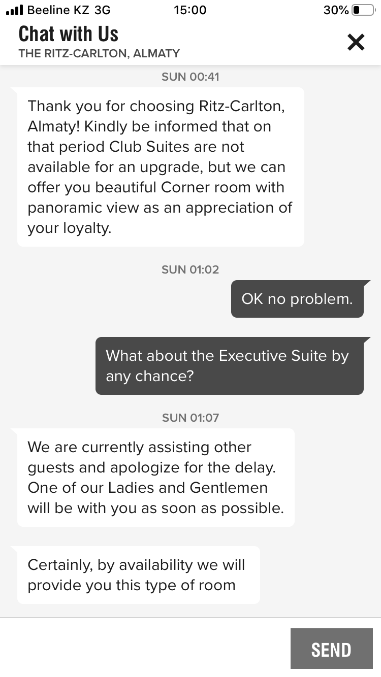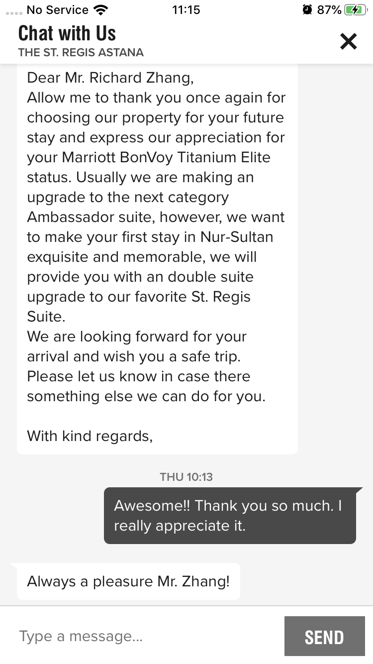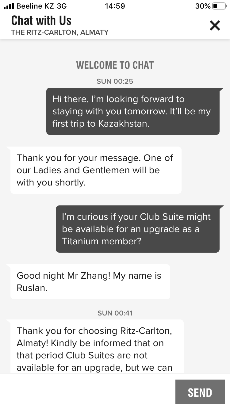 Again, I used the same tactic in my opening message: this was my first trip to Kazakhstan, so hey, I’d love one of your nicest suites please, to make this trip as memorable as possible.