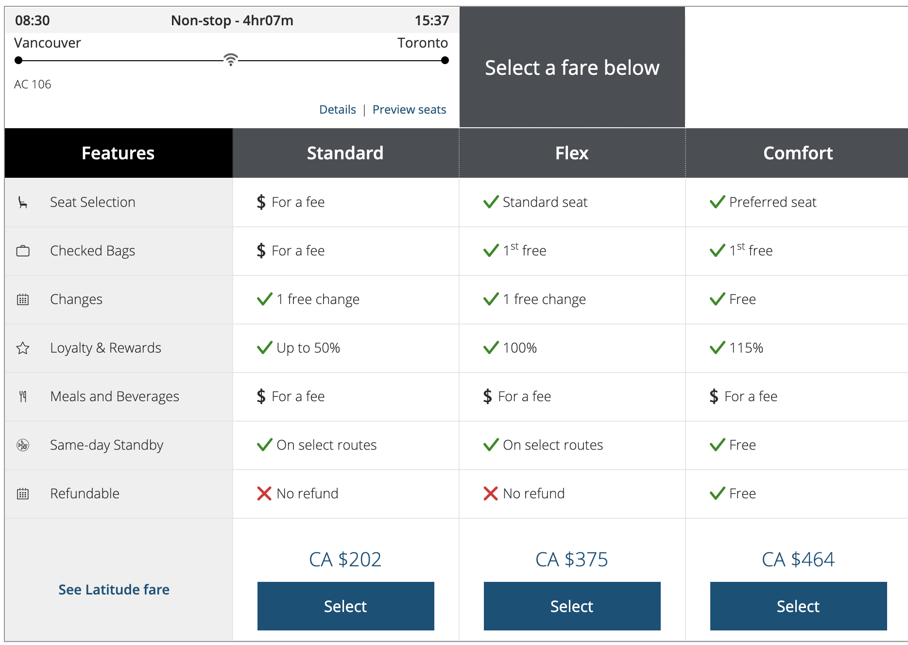 As you can see, the price jump from Economy (Standard) to the fully-refundable Economy (Comfort) fare is quite steep. If you’re only interested in the cancellation policy, it’s more expensive than the Aeroplan cancellation fee, which you wouldn’t even need to pay unless you actually do cancel the ticket.